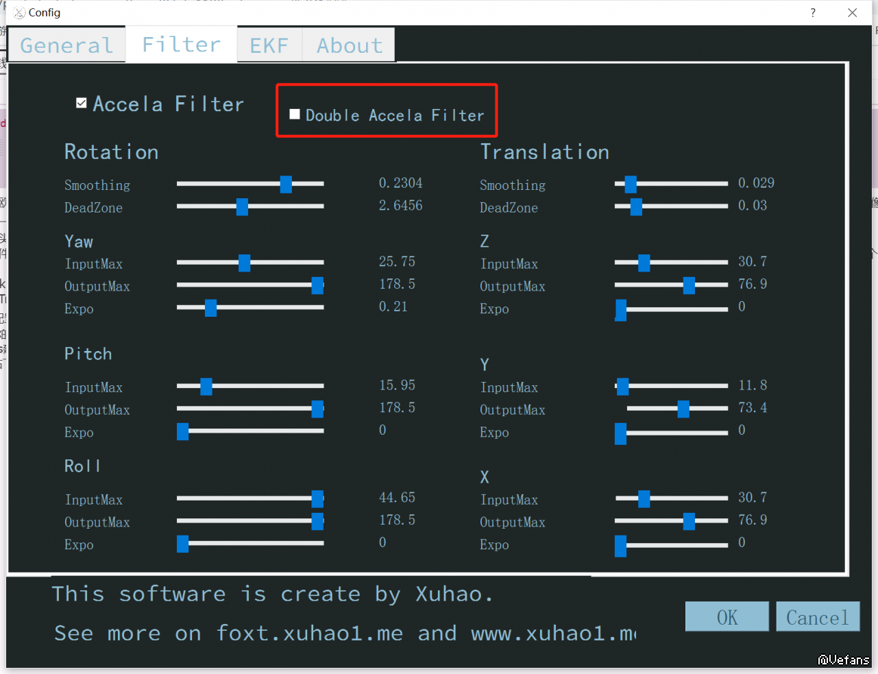 接下来点击上方的Filter页面,如果配合“小章鱼”OpenTrack使用,则不选定Double Accela Filter。根据我的使用情况,下面只将Rotation的Smoothing调高就可以了,其他的不用动。