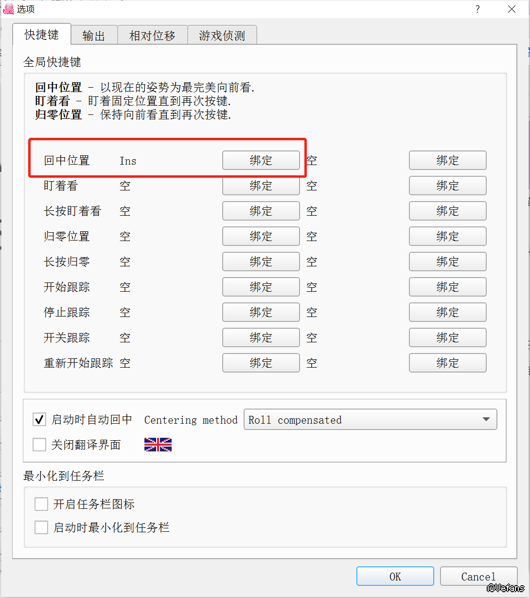 右下方的Hotkeys建议设置一下回正键,点击Bind后再点击想要绑定的按键即可。