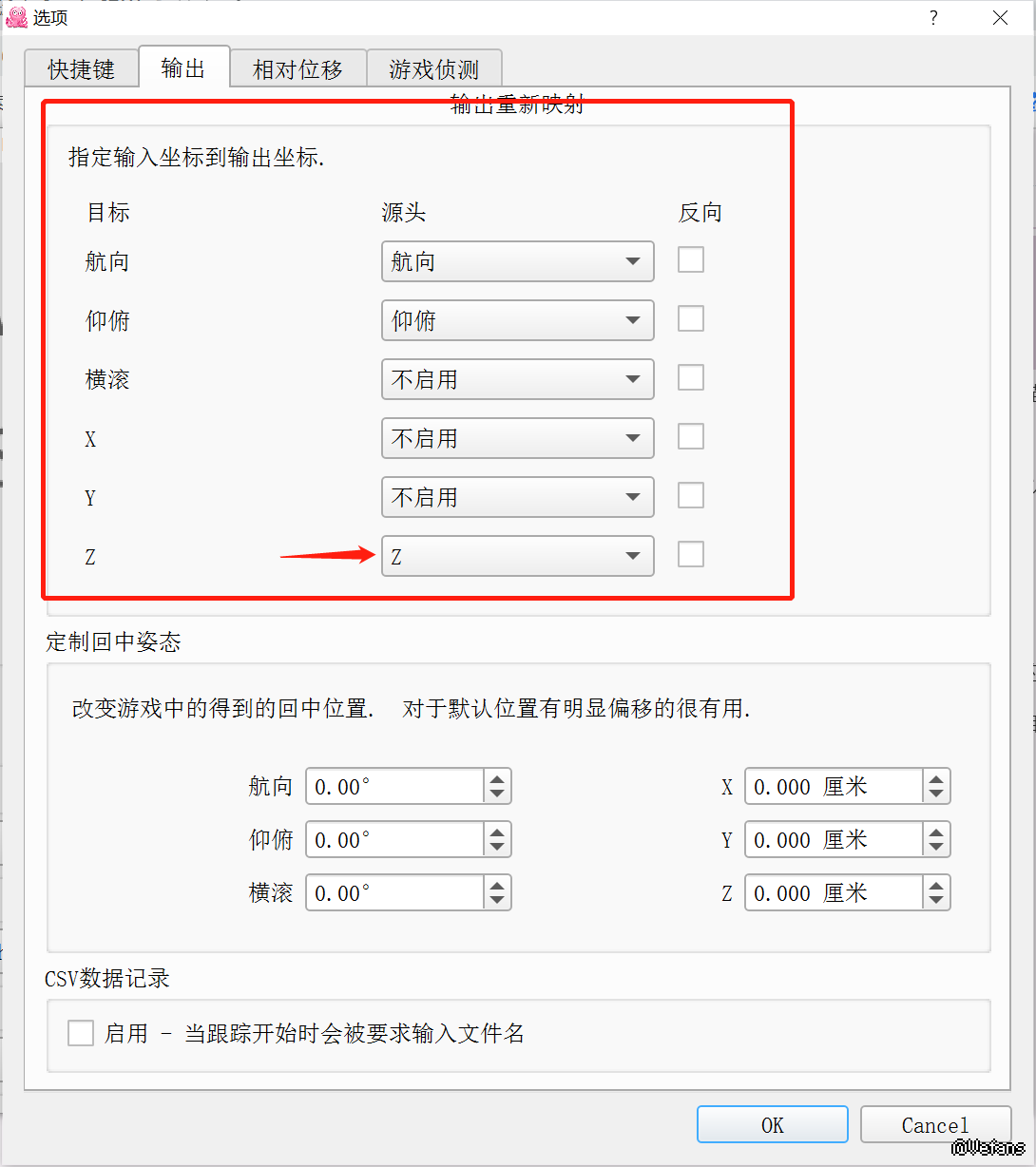 点击“选项”,快捷键界面的回中位置建议设置一个喜欢的按键,输出界面按照红框里面进行设置,请注意Z轴是拉近和远离仪表台视角,就是凑近摄像头仪表台拉近,反之远离。不需要这个功能也可以选择不启用。