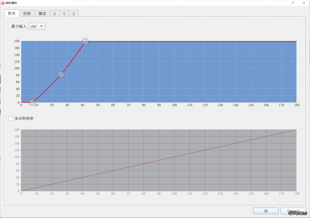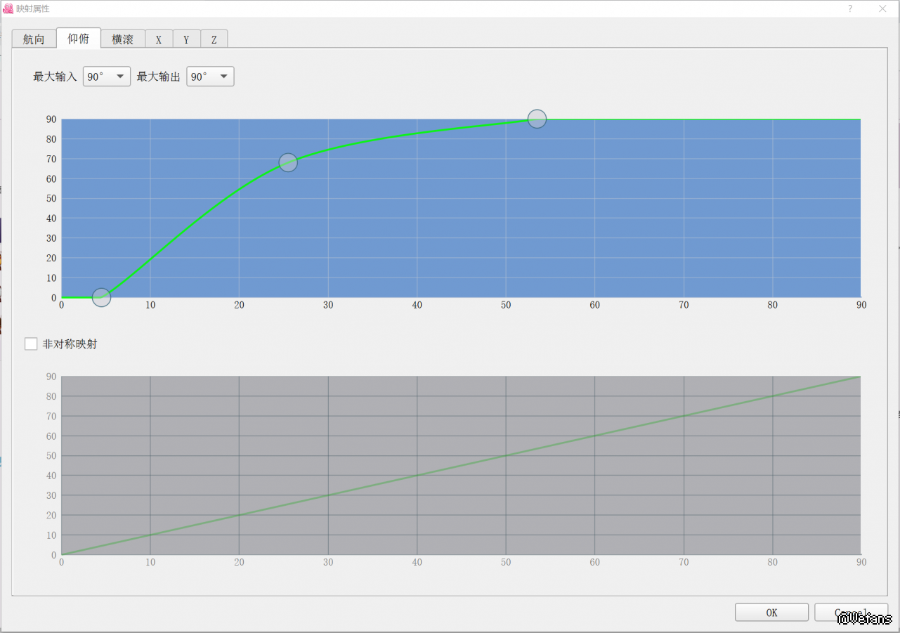 点击“映射”,出现的这个界面可以参照我的进行调节,我比较喜欢头动较小的角度就获得较大的转向,因此调的比较激进,因为这样比较适合笔记本的小屏幕,大屏幕的可适当的将曲线调的平缓一些。