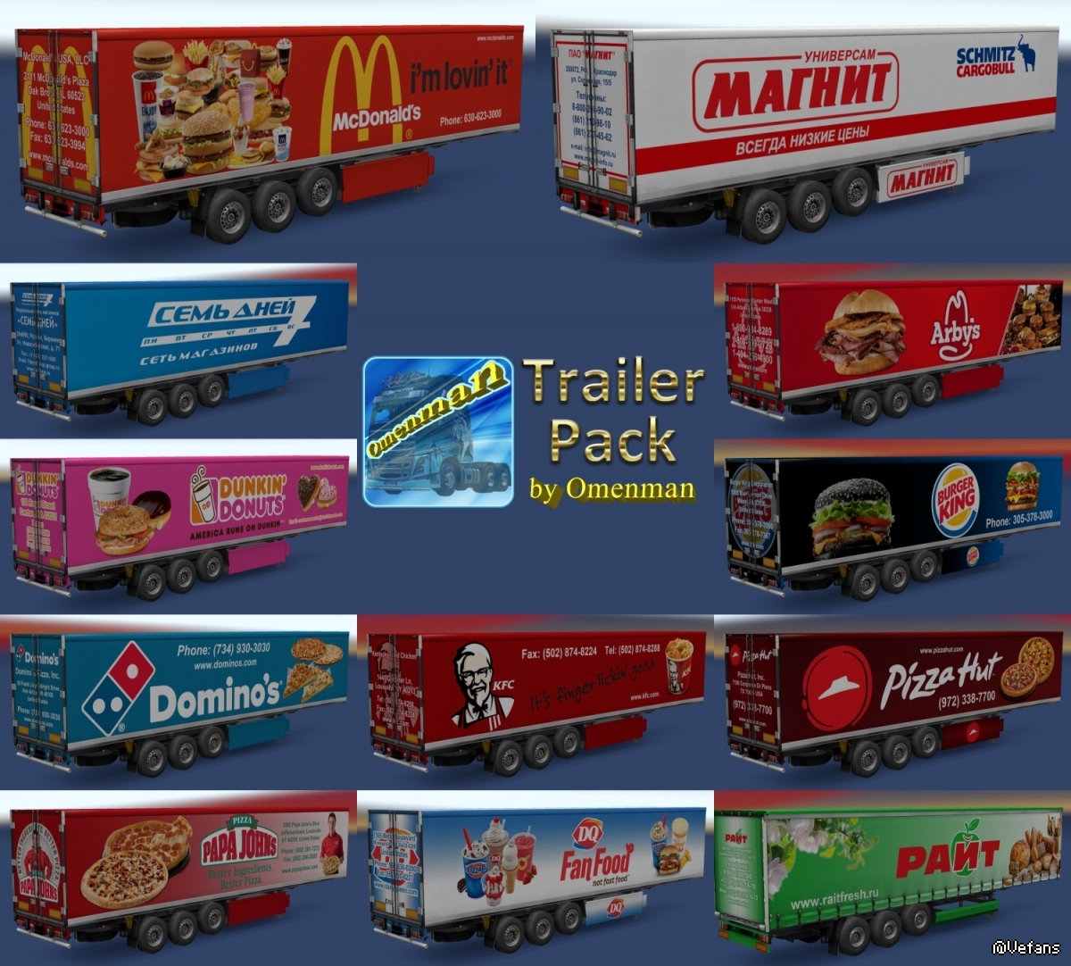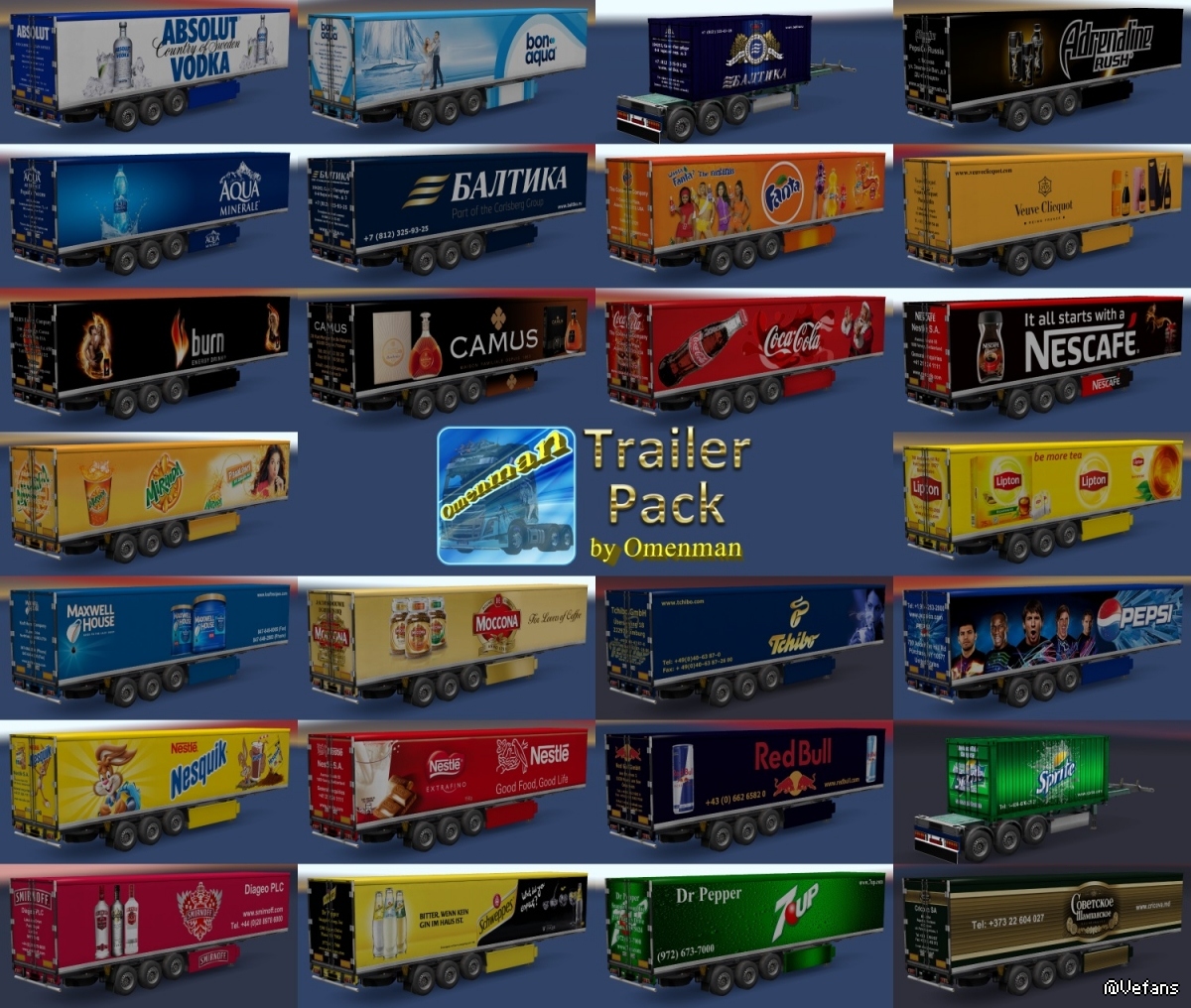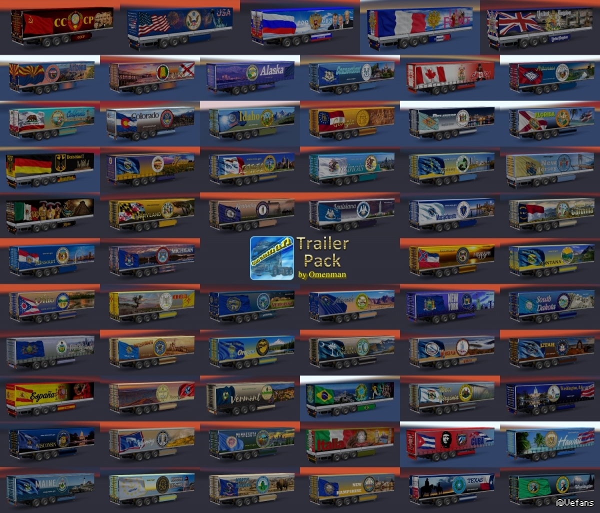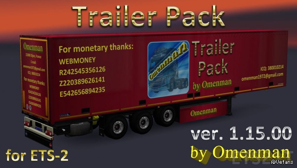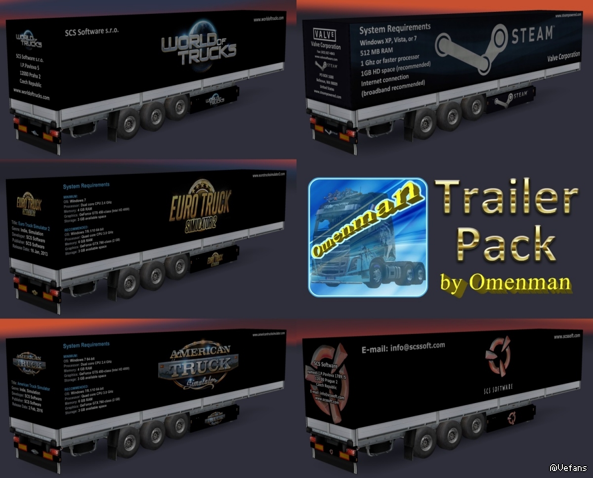 Trailer Pack by Omenman v.1.15.00 Description: Big pack trailers with skins from Omenman. In the package 106 company, 70 cargo and 300 skins on 7 trailers (Fuel, Coolliner, Fridge, Profiliner, Container, Schmitz Universal and Rommi Schmitz). United 10 mods and 1 trailer: – Trailer Pack Cars ver.1.02.00 (50 trailers) – Trailer Pack Clothing ver.1.02.00 (19 trailers) – Trailer Pack Drinks ver.1.02.00 (26 trailers) – Trailer Pack Electronics ver.1.03.00 (50 trailers) – Trailer Pack Foods ver.1.02.00 (12 trailers) – Trailer Pack Fuel ver.1.02.00 (12 trailers) – Trailer Pack Games ver.1.01.00 (5 trailers) – Trailer Pack Geographic ver.1.02.00 (63 trailers) – Trailer Pack Logistic ver.1.04.00 (32 trailers) – Trailer Pack Stars ver.1.04.00 (30 trailers) – And trailers “Omenman” ver.1.03.00 Changes in version: 1. All trailers have a renewed registration of cargoes in accordance with the profiles of companies and types of cargo. 2. Added companies from DLC “Vive la France!” and DLC “Italia”. 3. Updated the skin of the trailer “Omenman”. 4. Changed the format of the package version. All trailers are autonomous and included in the traffic. For version 1.30