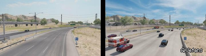 This mod significantly increases traffic in large urban areas; these areas are defined as the San Diego Corridor – Los Angeles, San Francisco Bay Area, Sacramento, Reno, Las Vegas, Phoenix, Tucson, Albuquerque, Portland and Seattle; Traffic elsewhere is kept to a standard level, which I consider to be quite realistic.