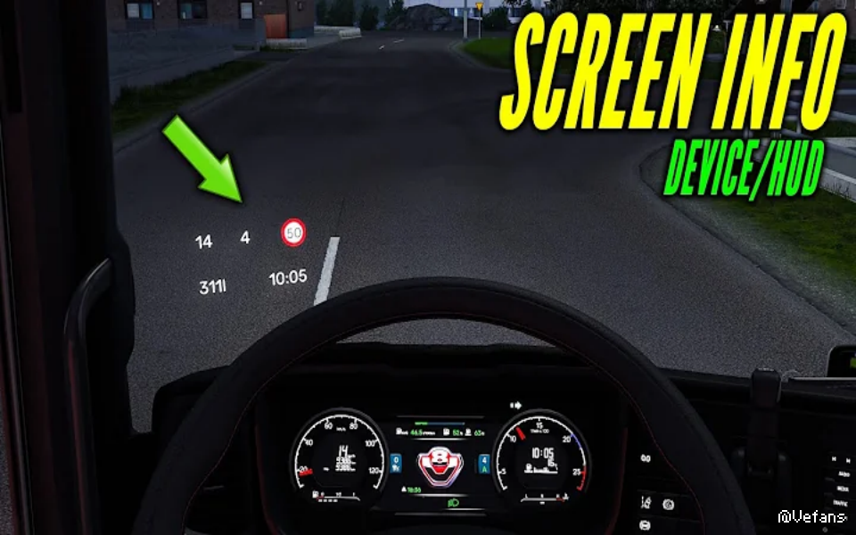 Adds a virtual projection to the windshield with information: current speed, cruise control, speed limit, gears, game time, fuel information. The mod is registered as optional. It can be used in convoys.(not to be confused with TMP).