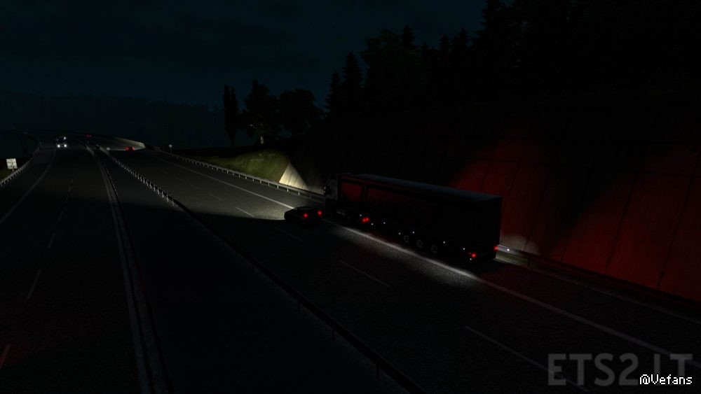 The lights from the car who follows you will reflect on your cabin, like normal, but in bigger amount- not normal. This is SCS problem because the textures for the truck are translucid (the lights goes through them).