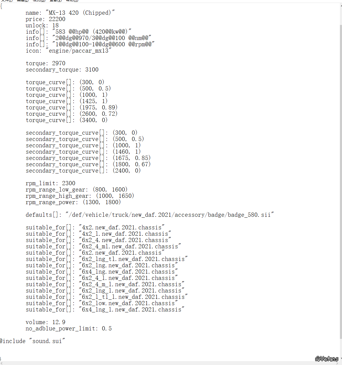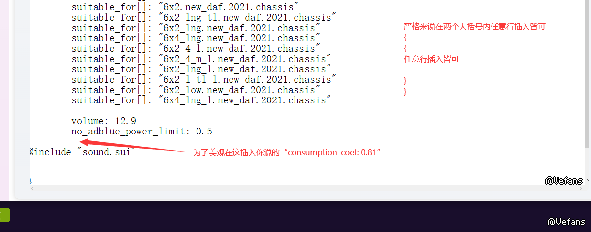 虚心求教!想不关掉真实油耗 通过更改SCS文件内发动机参数降低油耗!懂得大佬 请赐教在发动机参数sii格式文件中 并未找到consumption_coef: 0.81 这行油耗参数 想问一下可不可以把这行参数粘贴进去,如果不可以的话如题 该怎么操作