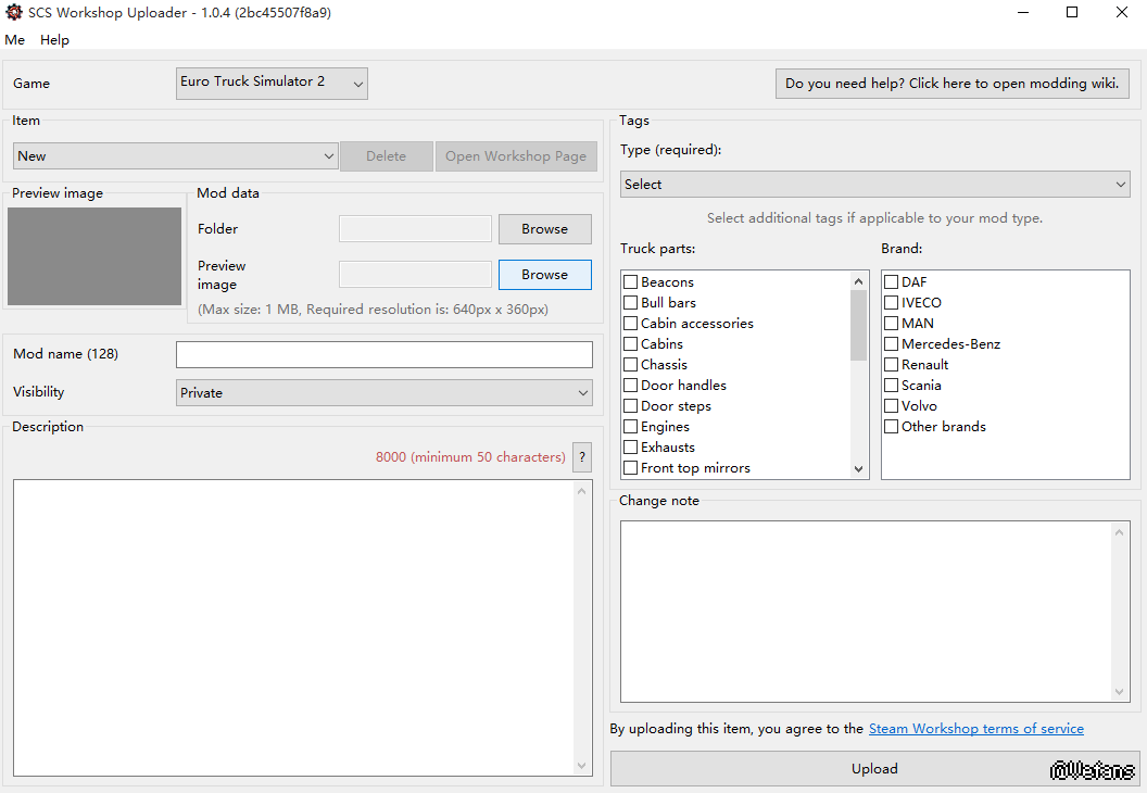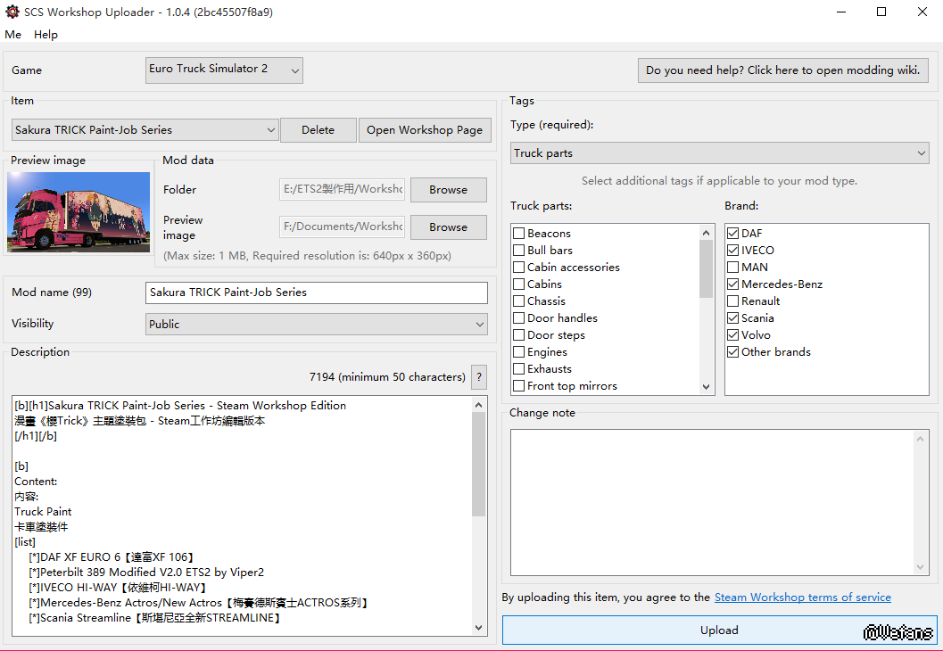 Game:選擇你需要將你的物品上傳到哪個游戲的工作坊,分ETS2和AmTS兩種。