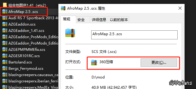 2、在MOD文件夹中,找到你想要汉化的地图MOD,我们拿这个非洲地图MOD做了例子。MOD是SCS后缀的文件,我们可以用常见的解压软件打开,(注意:是打开,不是解压。)
