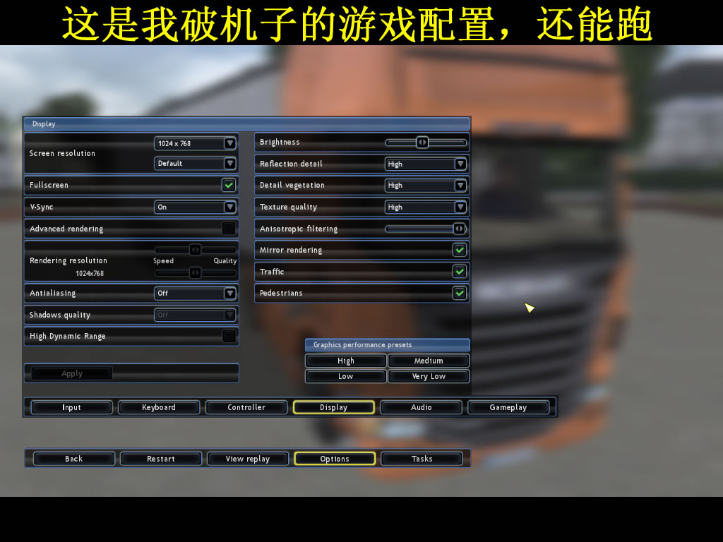 把几个设置给开高了,在游戏里还能跑。。。发现不能放德卡的MOD,一放就被弹出,欧卡的MOD没试