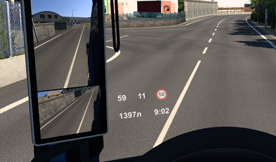 该模组正在 GPS 插槽上添加带有 trasparent backgroup 的配件,其中包含有关速度、档位、巡航控制、限速、剩余燃油和当前游戏时间的信息。