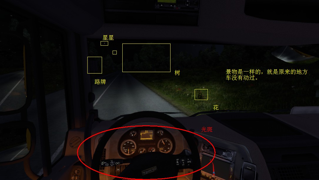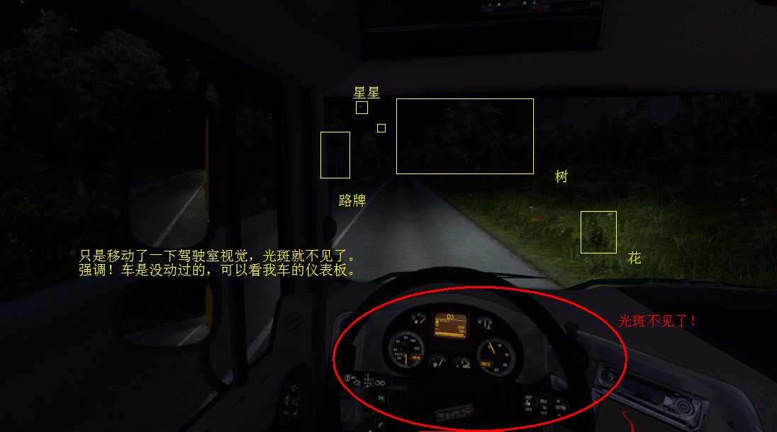行驶至某些路段的时候会出现这些光斑,一闪一闪,不论是白天还是晚上。移动一下驾驶室视觉就没了,恢复刚刚的视觉又出现了。上图~