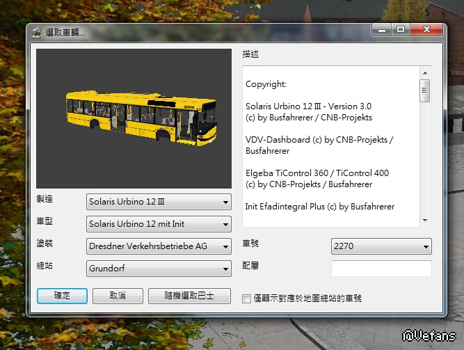 不建议最后一版Solaris Urbino 12去装论坛里的那个报错补丁,那个补丁是给前一版用的。虽然那个补丁也能用在V3的Solaris Urbino 12上但是设置IBIS的时候车头的只有线路号而没有终点站显示导致乘客不会上车(最起码我是这样的)。用其他地图语言启动器来启动游戏的话这车一切正常压根就不用上补丁。