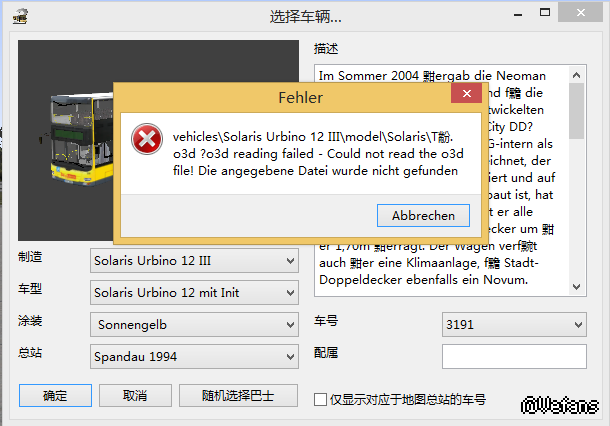 在选车时选择了SU12就出现03d报错,按了Abbrechen然后车辆出现时没有车门和轮胎