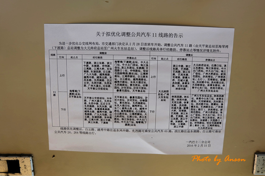 上个月交委的消息要把广州一汽11路车线路大更改 从原来的天平架开往(下渡路)海琴湾,更改为大元帅府开往广州火车东站总站,由此一更改,11路车走向已经跟原来的大不相同,且不再经由曾经11路车经典的总站 越秀中,因为见证过11路车从沙河到越秀中,再到后来越秀中到天平架,再到现在的下渡路开往天平架,明天首班车就要再次更改了,而且还是大改,所以本月20号那天特意去再回味一下当年的经典。大致更改行程如下“”