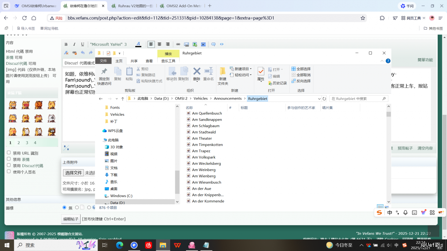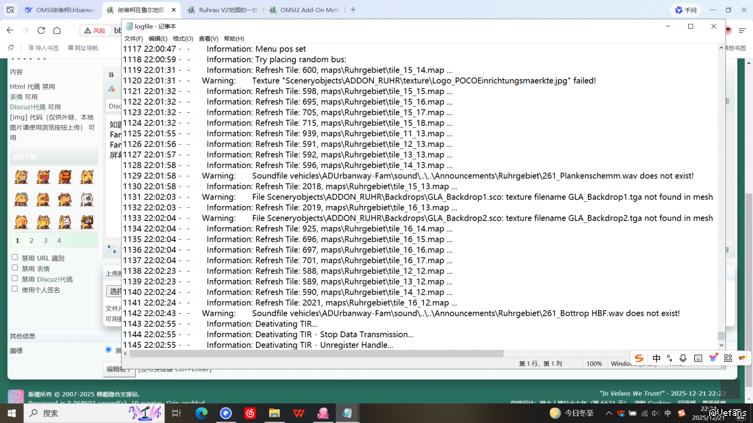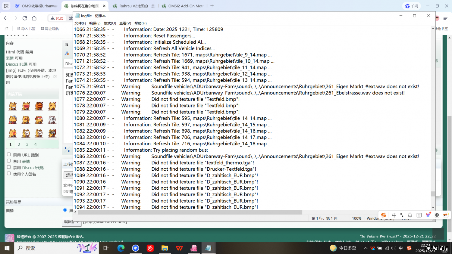 如题,依维柯urbanway在大都会鲁尔DLC行走261路没有报站,别的线路没试过,检查log发现22:02:43 - - Warning: Soundfile vehicles\ADUrbanway-Fam\sound\..\..\Announcements\Ruhrgebiet\261_Bottrop HBF.wav does not exist!以及22:01:58 - - Warning: Soundfile vehicles\ADUrbanway-Fam\sound\..\..\Announcements\Ruhrgebiet\261_Plankenschemm.wav does not exist!之类的报错,hof用的就是Ruhrgebiet,时刻表及电牌都正常,乘客正常上车,报站屏幕也正常切换站点,只是报站没声音,看log是缺报站文件了,检查vehicles\Announcements\Ruhrgebiet里是有很多文件的,用了德语非U启动,这辆车在别的地图报站是正常的,看网上人家玩同一条线是有报站的,求教大佬怎么改什么问题