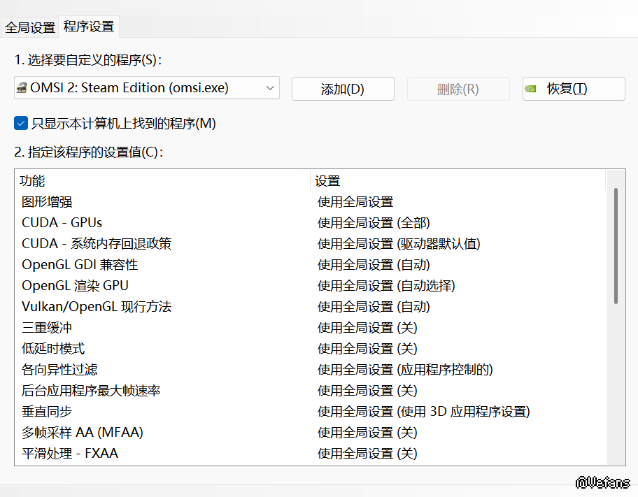 今天心血来潮(手贱)更新了一下黄伟达最新版本的显卡驱动,中午没更新的时候还好好的更完之后又开了一下omsi,发现又回到了之前满屏狗牙的画质,打开控制面板发现所有都被还原成默认设置了。如果调整全局设置有些软件字体渲染会炸,怎么才能保证显卡驱动更新的时候不被覆盖