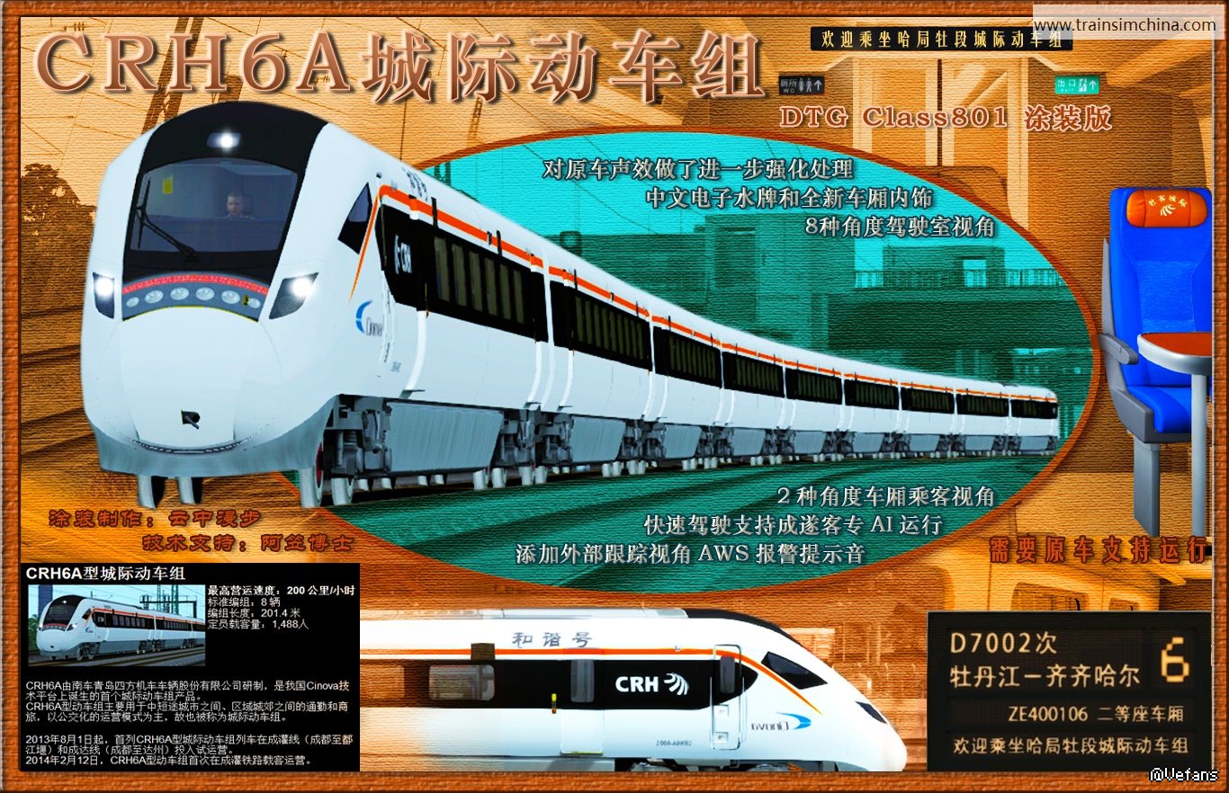 CRH6A涂装版,原型车为官方出品的DTG Class801 EMU,主要对原车声效做了进一步强化处理,添加了外部跟踪视角AWS报警提示音,新增8种不同角度的驾驶室视角和2种不同角度的车厢乘客视角,全新车厢内饰,中文电子水牌,车辆编号改为电牌中显示,9节编组快速驾驶并支持成遂客专AI运行。