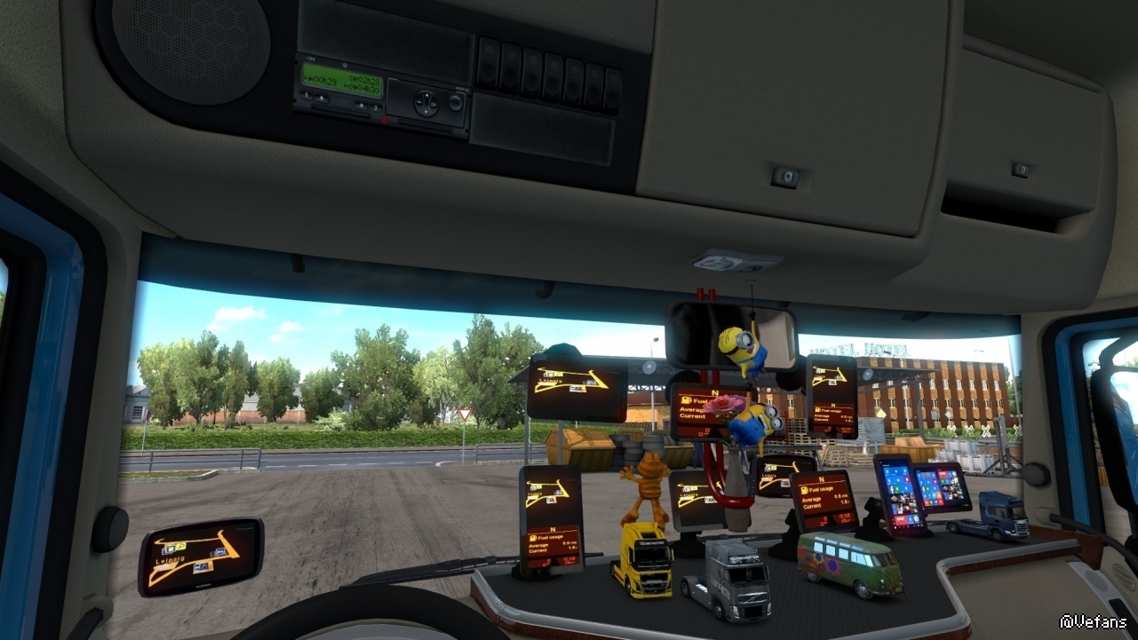 This mod contains over 400+ cabin accessory items suitable for your taste, bringing female and male co-drivers, bobbleheads, accessories for truck driver needs, snacks, electronic devices, computers and tablets, lots of scarves, fresheners, toys and many many more…
