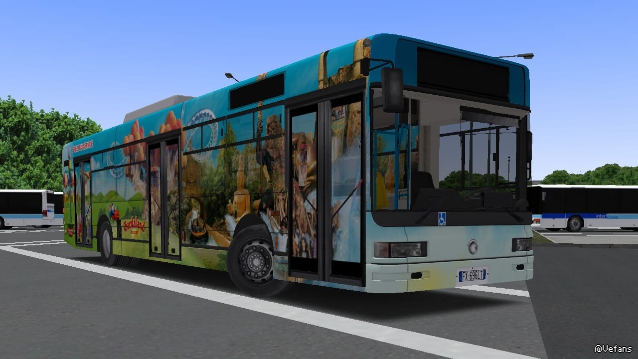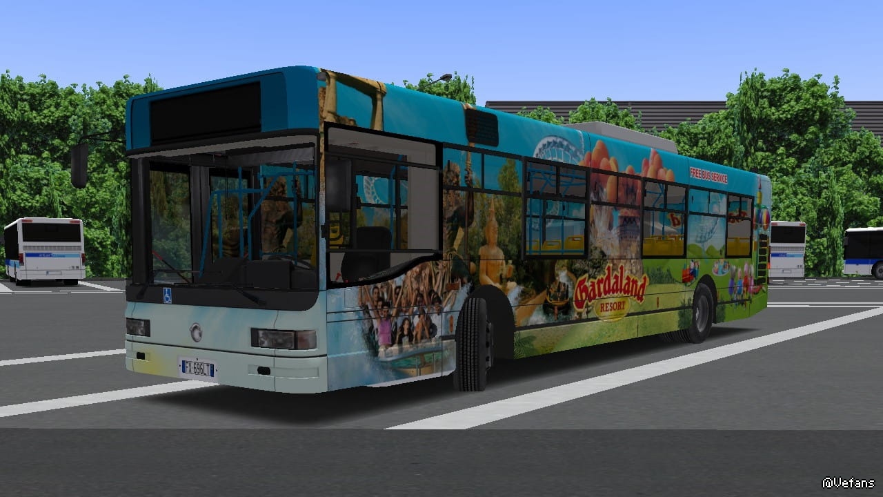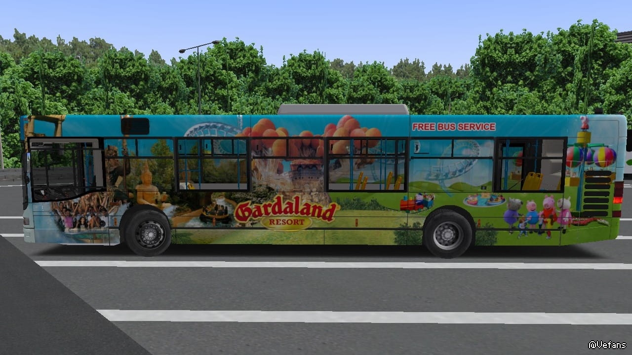 Ready to return to amusement park no. 1 in Italy ?? So get on board the "new" free bus service to the park: an Iveco / Irisbus CityClass 491.12 !!! To replace the old bus service, which were CAM Alice's, Gardaland decided to purchase 4 Iveco / Irisbus Cityclasses from Air Pullman Assago (Milan), and to create 3 different liveries to use them as free bus service to connect Peschiera del Garda Station or the Gardaland Hotels at the Amusement Park. The 3 liveries are: Legoland Waterpark; various roller coasters in the Park; various attractions and Peppa Pig Land (the latter is the one we made). In the Repaint you will find: - Original vehicle plate; - Gardaland livery of various attractions and Peppa Pig Land on doors and windows; - Blue inner poles; - Fainsa arianne dual color seats (yellow and orange); - Different texture for the steering wheel - Gardaland personalized sign To use the wheel different from the original one in the game, add the following wording to the "Model_491.12" file, inside the "Model" folder of the vehicle: [CTCTexture] Steering_Iveco Steering_Iveco.png We hope you enjoy the repaint !!