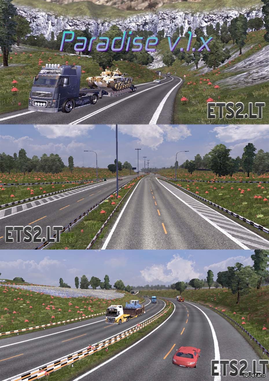 Paradise v.1.x Add-on tested and works with all Versions of ETS 2 1.4.8 TO 1.8.2.5S, TSM 4.1.2 to 4.5.4a, DLC East and all other Maps.