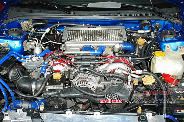 三菱的TD05H涡轮,炮制出了第一代的STi限量版车型,开创了WRX STi版的先河。C型开始,WRX进入第二代,1995年8月,STi部门才推出了以GC8C型为基础的第二代WRX STi,第二代的引擎是EJ20G/C型,也就是第一代改进型所使用的引擎,马力输出已经达到了275匹,离自律上限只有一步之遥。 第二代是EJ20G引擎全盛时期,随着引擎技术和机械工艺的发展,它已经跟不上时代的步伐了,虽然EJ207已经进入了研发阶段,但为了延续WRX和STi的性能,Subaru还是推出了代号为EJ20K型引擎,这台引擎是EJ20G型的强化版本,其中最大的分别应该是涡轮增压器了,过去Subaru一直在用直接竞争对手三菱的TD涡轮,而K型则换上了IHI的产品,也就是到了今日仍被广泛使用的RHF5及其派生型号了。对于车型而言,从第三代开始,除了四门标准型外,STi将零散的版本进行收纳,轻量化的版本名为Type-RA,而轻量化的双门版则称为Type-R。使用RHF5HB涡轮的EJ20K型又分为三代使用的EJ20K/D型和四代使用的EJ20K/E型,前者使用了VF23涡轮而后者则是VF28,不过除了涡轮响应性和扭力输出不同外,EJ20K已经达到了280匹的上限。 从五代开始,代号EJ207开始成为STi车型的标准装备,一直服役至今,日规最新的十代也逃不过它的魔力,虽然过程中,这台EJ207被不断地改造,从最初五代六代时的双缸同时点火和VF28涡轮一直演化到单缸独立点火、VF34涡轮等等,但是其开放式的水道设计、屋顶型燃烧室等机械细节均没有重大改变,可以说,EJ207绝对可以称得上是日系引擎历史上一朵奇芭。 眼下这台EJ207,可以算是第一代的EJ207了,相比今天在国内常见的GD时代日规EJ207机器,其整体布局没有什么不同,打开引擎舱盖可以发现两者最大、最当眼的不同就是那个分火器了,七代之后使用的EJ207因为引擎管理系统的大幅进化,所以使用了单缸独立式点火系统,这样的设计优点很多,起码可以用跳火强劲、引燃精确来形容。而在第一代EJ207,也就是Impreza第五代STi推出之时的1998年,虽然使用单缸独立式点火已经开始日渐增多,但并不普遍,环顾其他日系引擎中,只有一些已经可以纳入超级跑车行列的在使用,例如NSX、GT-R、Supra等,而作为比这些车型稍低一线的STi或者对手EVO并没有跟进,而是坚守着,不是他们不能用,而是对于引擎管理系统的要求暂时还不高,而且那时日本对废气排放的管制还没有今天严格,当然也有节省成本的用意了。