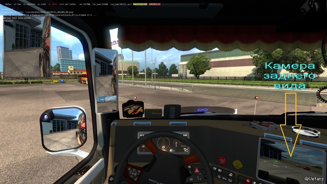 The mod should be above the truck. To work, you must turn on the mirror hud (one click F2). Then turn on the "O" button (beacon button). The image depends on the selection of the main mirrors.