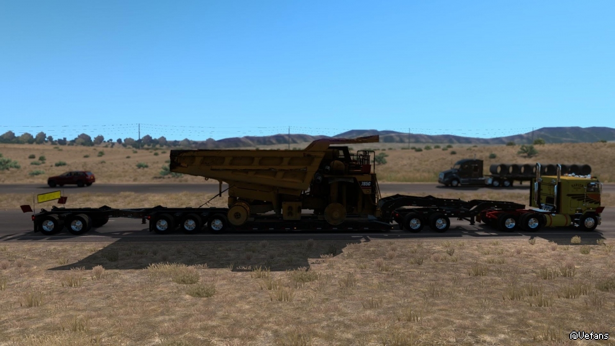 This mod adds CAT (aka MUTT) 785C as a new heavy cargo to your game. It requires Heavy Cargo Pack DLC because it uses some resources from that pack (jeep, spreader and some textures). The trailer provided with this mod is a modified 3 axle "Lowboy 55L" (aka Magnitude 55L) with added spreader attachment. Note: this load is very wide, wider than any currently available cargo in ATS - that might cause some issues.