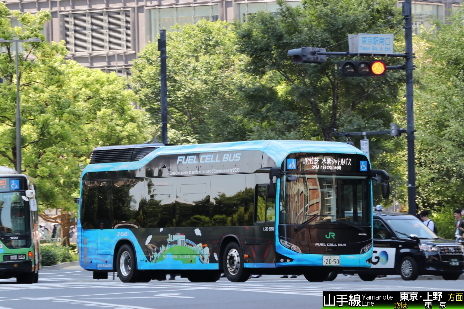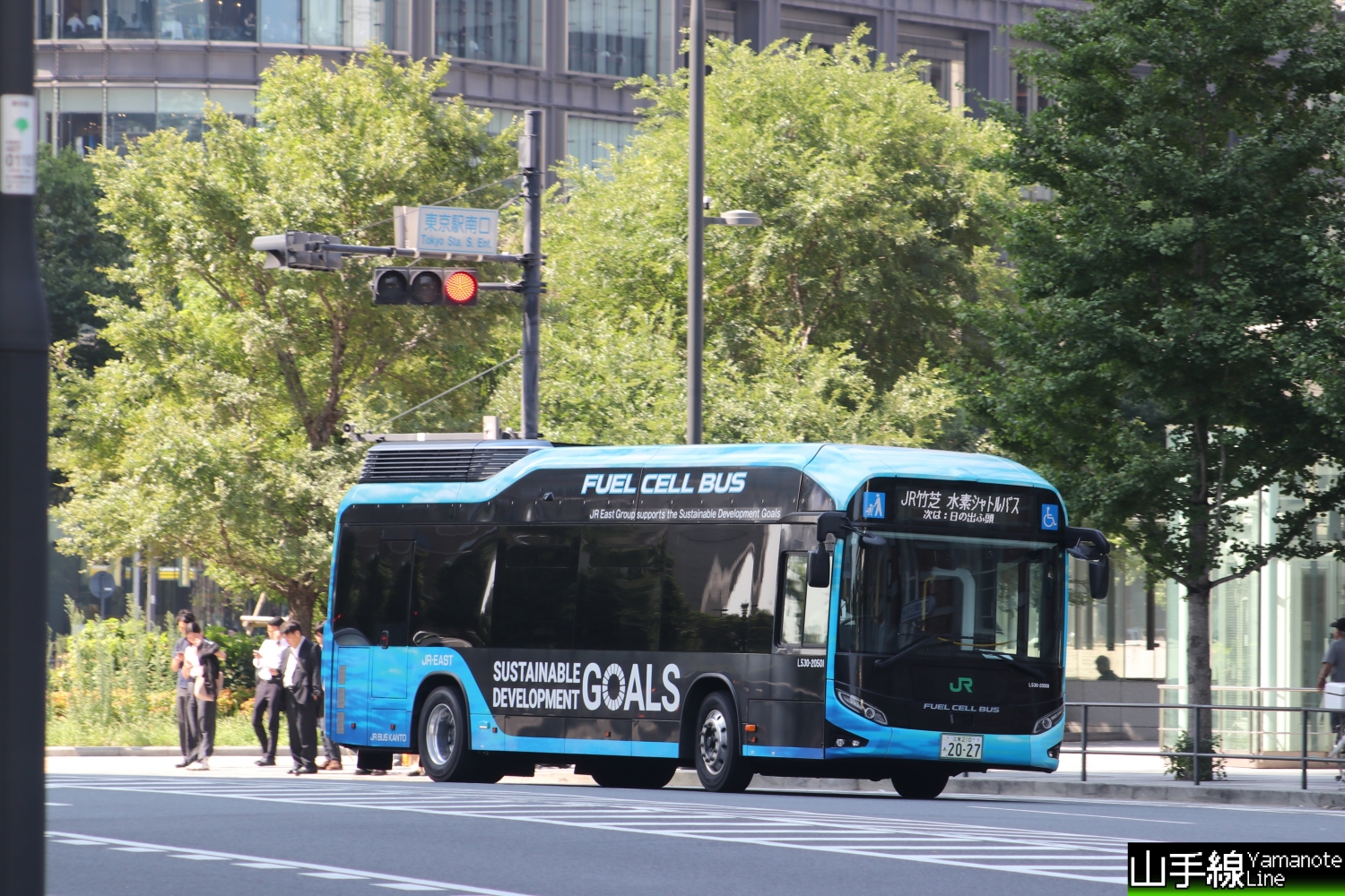 作為「零碳挑戰 2050」計畫的一部分,JR 東日本集團正在濱松町站週邊地區運營一輛燃料電池巴士(JR 竹芝氫氣穿梭巴士),該計畫旨在到 2050 財年實現二氧化碳排放「幾乎為零」。(Google Translate)