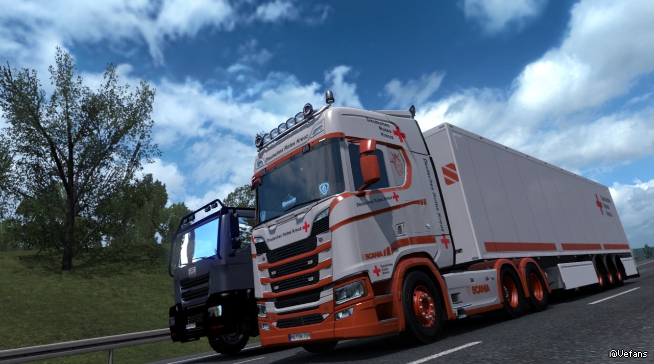 MAN TGX(德国境内涂装)、Mercedes-Benz Actros 2014(北威州涂装)、Mercedes-Benz Actros 2009(北威州涂装)、Iveco Stralis(北威州涂装)、SCANIA S(虚构涂装)、Renault Premium(国际援助涂装)、所有箱式挂车(德国境内涂装、北威州涂装)
