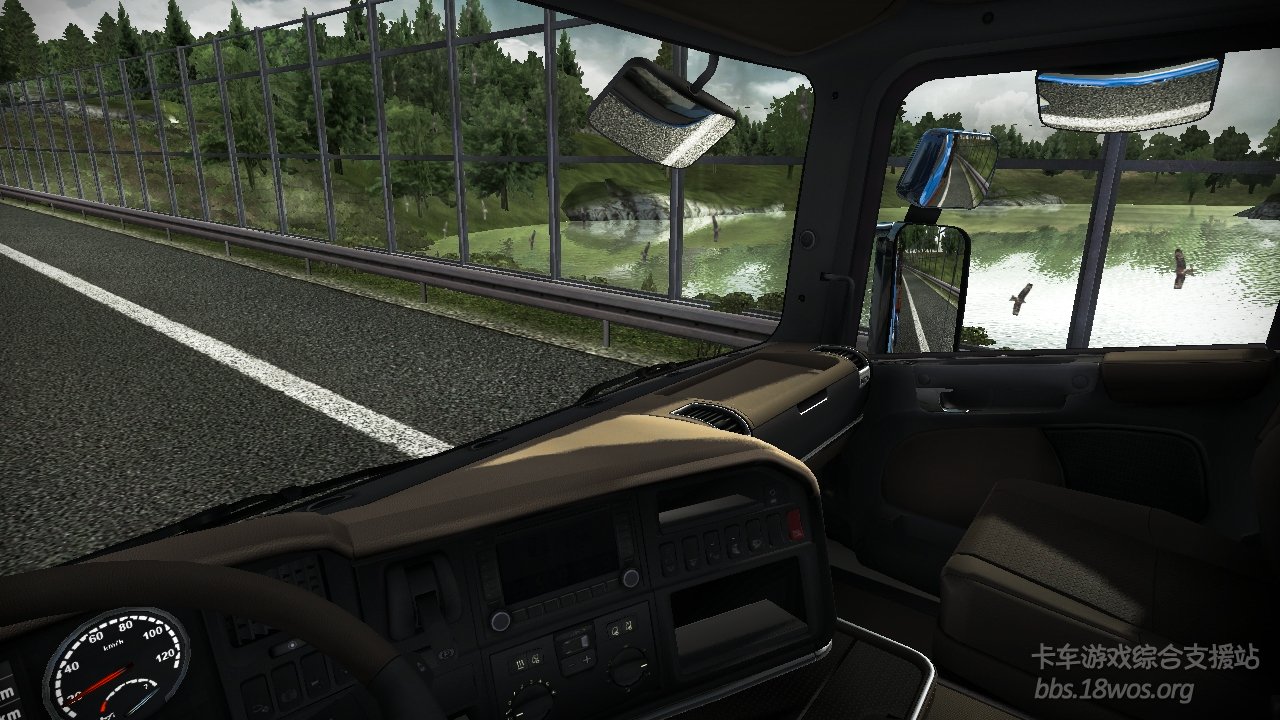 除了精细的仪表台外,SCS设计小组还为大家带来一个惊喜,在驾驶室里,玩家可以透过右边(游戏默认的是左方向盘驾驶室)的三组后视镜清楚看到右边的位置,这个是基于游戏中“定制车辆”系统又一亮点(我们会在稍后详述)。游戏中的卡车原厂状态下只配两组后视镜,也就是左右各一组,由于车身高度的问题,所以右前面和右侧处于盲区,为了提供与真车一样的全方位视觉,游戏提供了一项技术——定制车辆,就是允许玩家为车辆添加2组后视镜,通过增加右前侧和右侧后视镜可以看到车辆右前侧和右侧下方位置情况,这样右边的问题就可以解决了。这样的视觉能为玩家在为车辆做机动的时候提供更好的视觉条件。