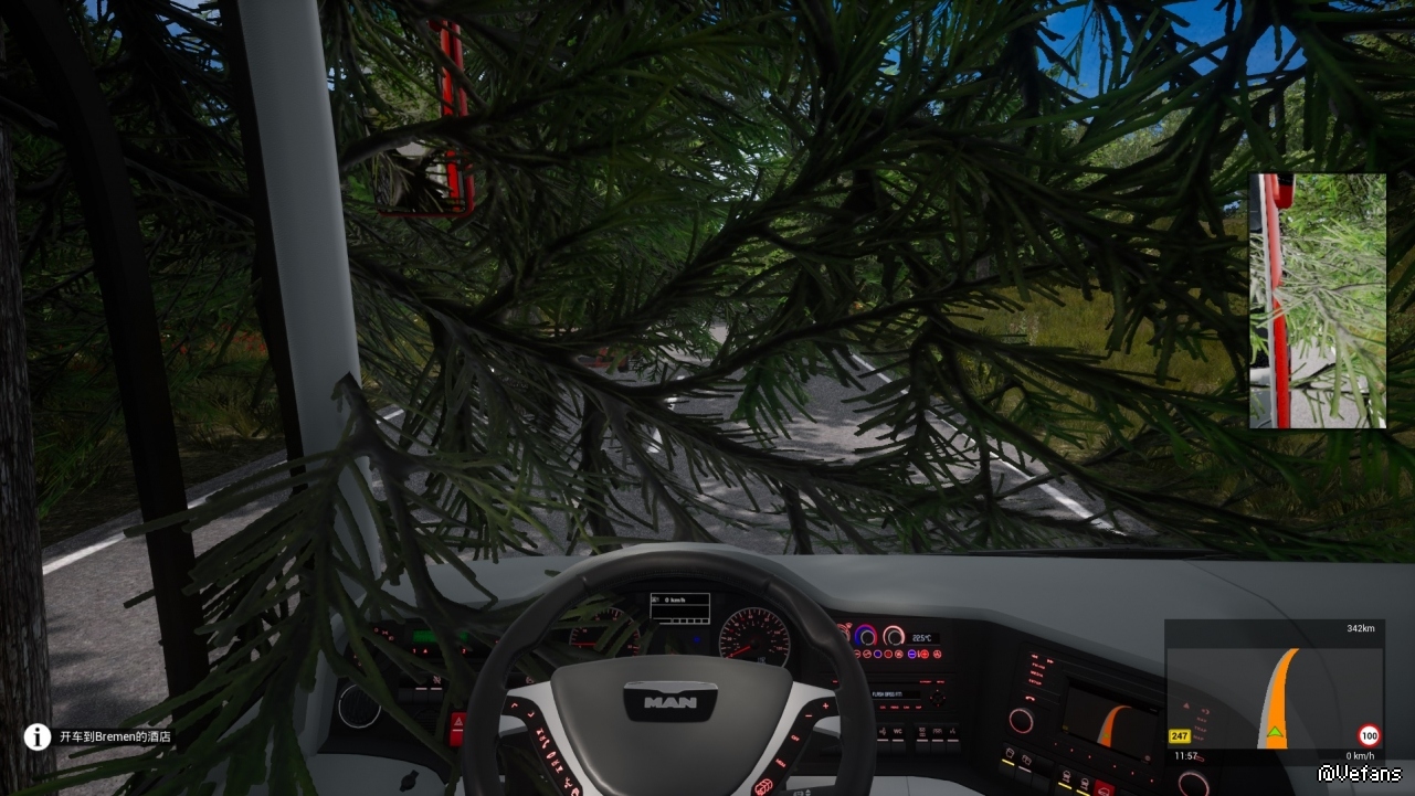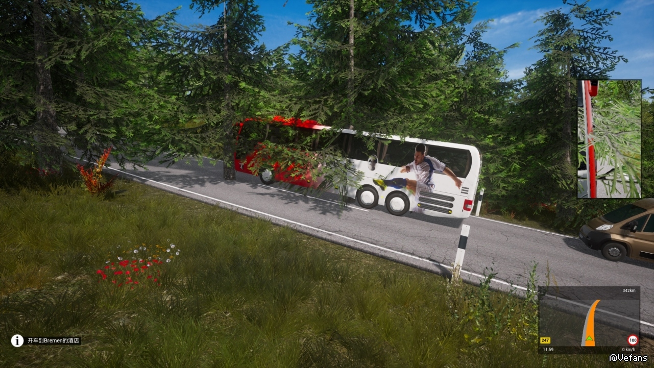 今天玩足球队巴士发现的BUG.游戏都出这么长时间啦竟然还能有这种错误.一路很多树木都在道路上速度根本就开不起来生怕和对面的车撞上.