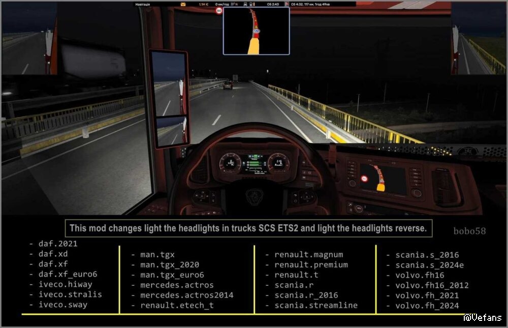 This mod changes the headlights in trucks in ETS2 and lights the headlights in reverse.
