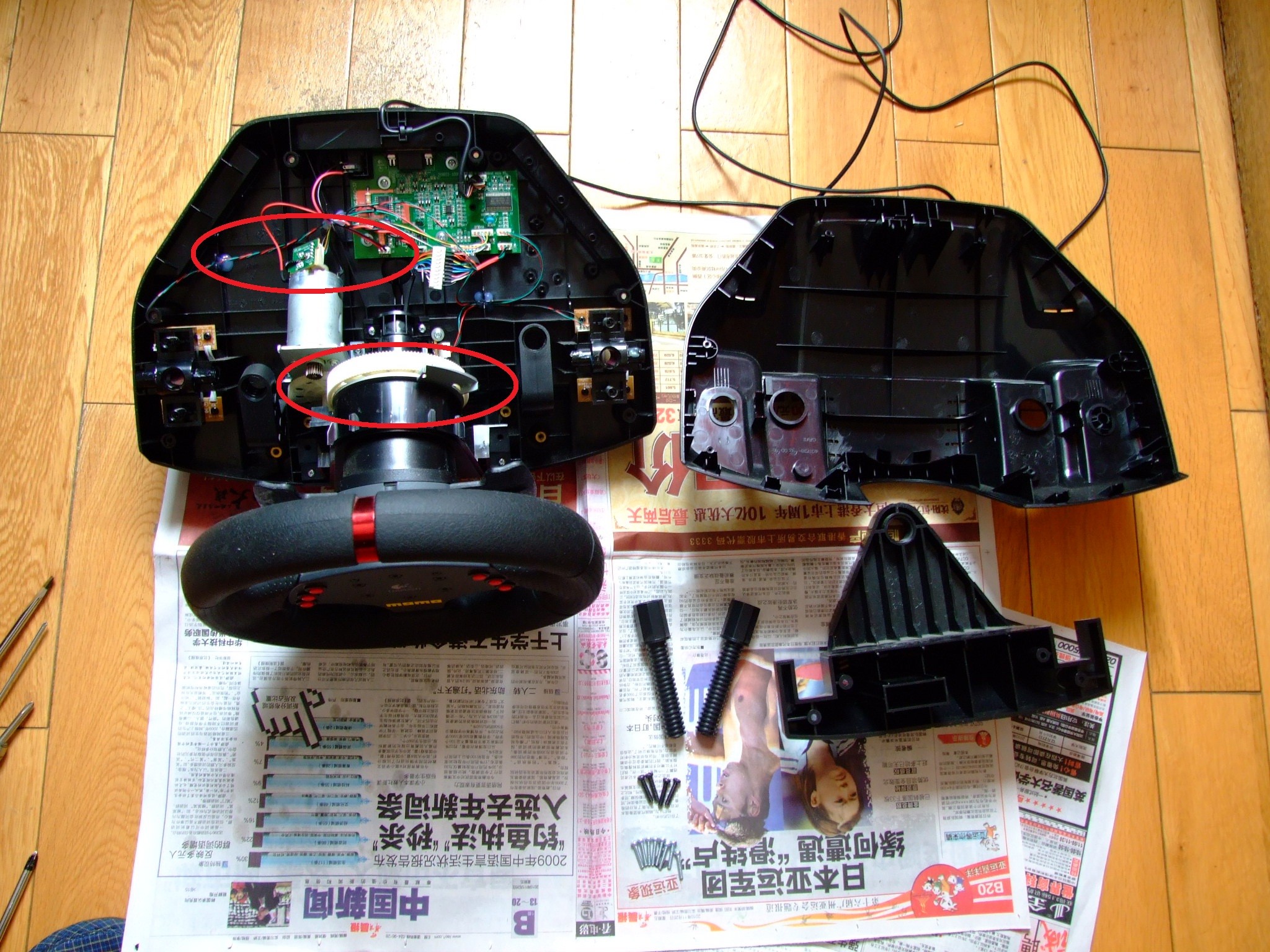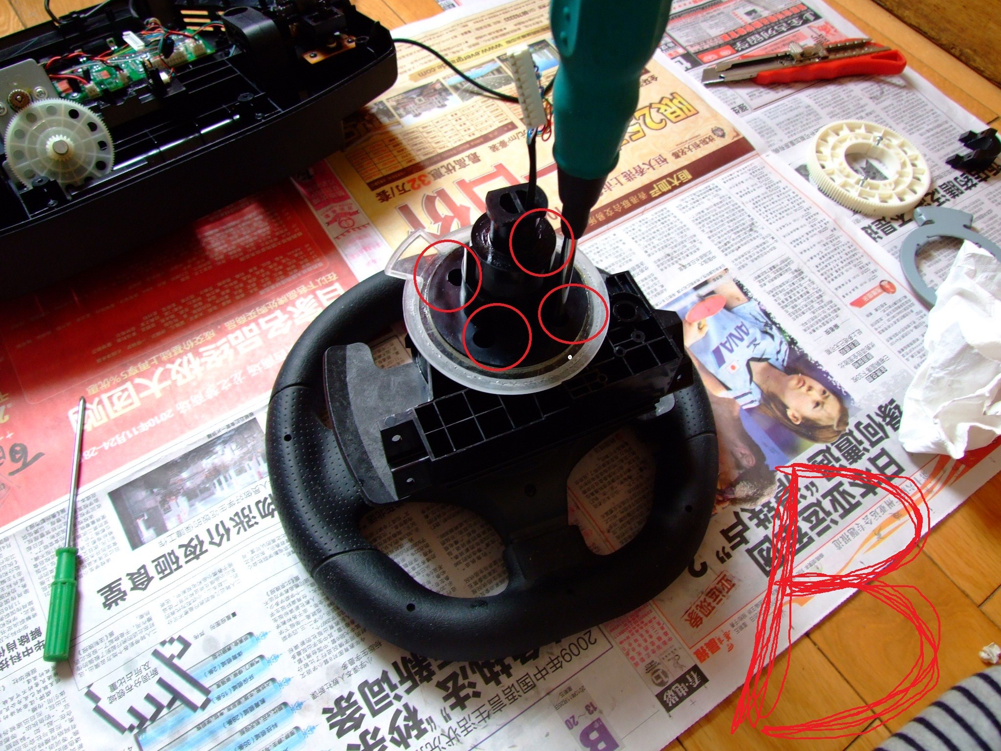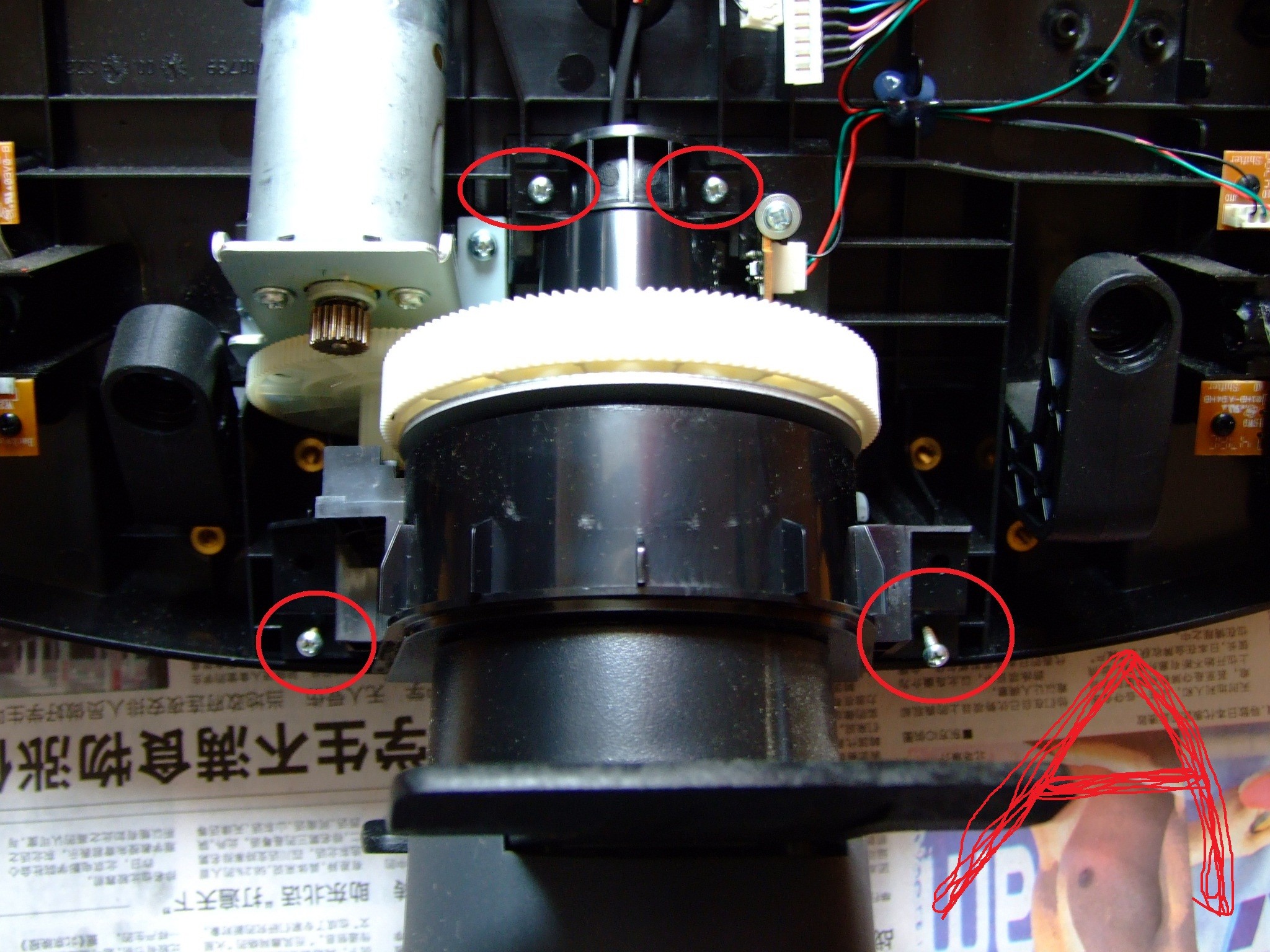 盘子主线得从这个孔中穿过去,比较棘手...然后拆两颗螺丝拿下白齿轮,再拆四颗螺丝拿下盘体套筒,拿出卡环!