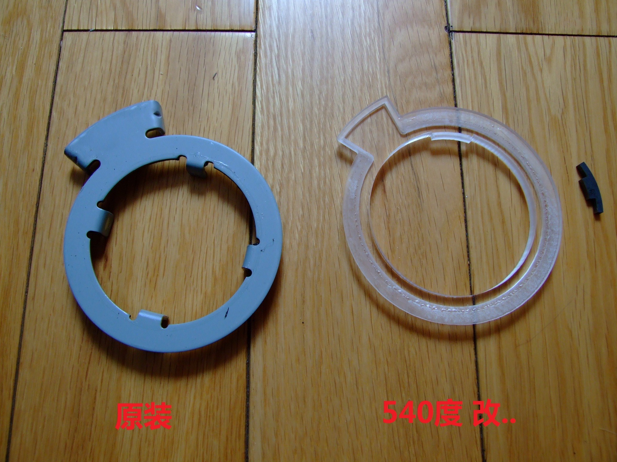 亚克力材质的卡环做工比较粗糙,但装上后并无大碍,而540度的碳钢卡销由于过厚导致安装后盘体无法旋转!必须打磨成400的厚度才能完美贴合