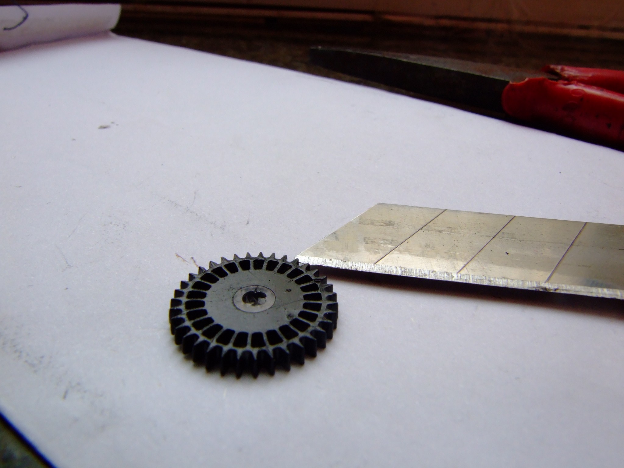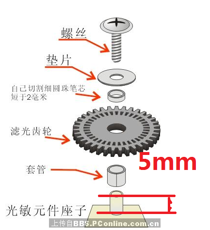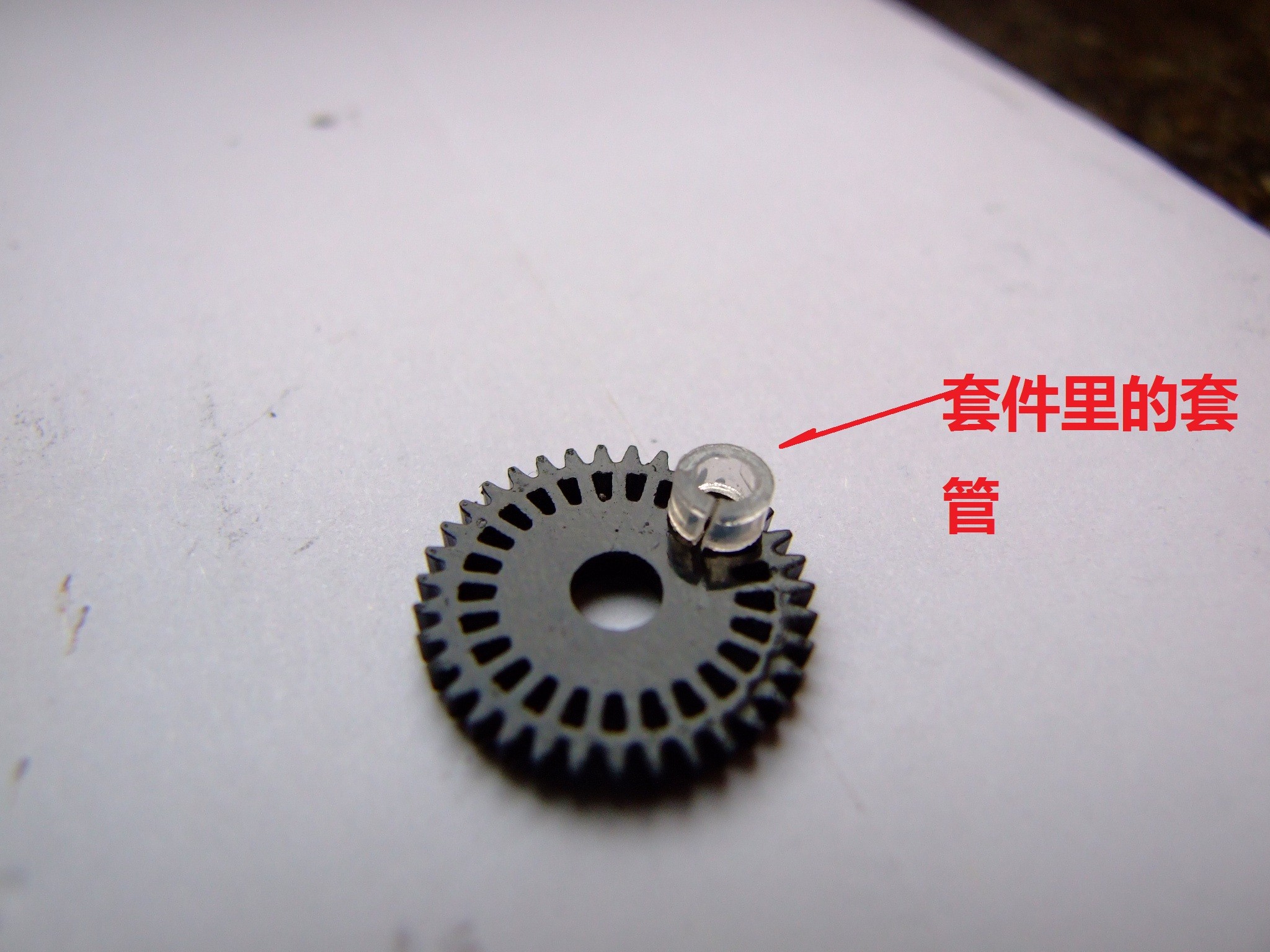 下面开始弄滤光齿轮,原装的滤光齿轮带个小底座,类似法兰盘的结构。而套件中的滤光齿轮没有这个结构,得自己追加套管!