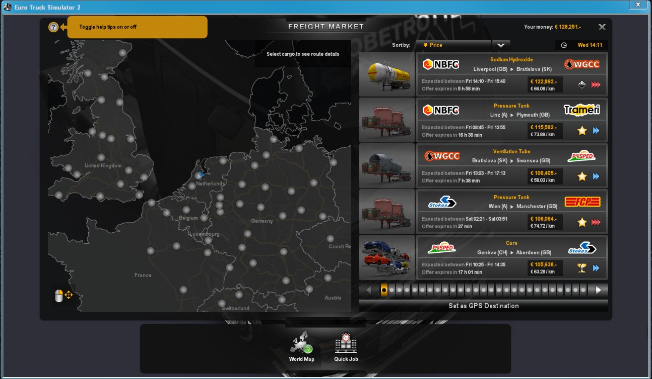 如圖,加急貨物與貴重物易碎品危險品並不衝突.所以前期最好加一點長途和兩點加急.之後再補上一點貴重物一點易碎品.這樣所得經驗能最大化.接下來再解鎖危險品,能拉的貨物就多了.