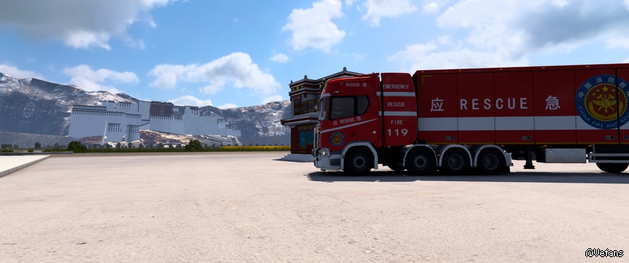 所以发现中华地图内有川藏路线时我赶紧下载,迫不及待地“飞”到雅安车库,开启我的假装318之旅。完全没想到作者那么用心!从康定到理塘间有段路,虽然有着完全不可能道路验收通过的坡度,但是作者用这个方式让玩家体验到车无论什么车到高原时都严重动力衰减是什么感觉——牛吼干瞪眼!以及同样不可能通过道路验收的弯道,让我直接想起了这段路上的“天路十八弯”。过了理塘望芒康,到八宿,其间一段同样违背道路验收标准的路,仿若就是“怒江七十二拐”。临近林芝时,大山返青,绿植葱郁,让我不禁想这个地图会不会真实到突然出来个鲁朗小镇,路边还有石锅鸡招牌的饭店(然而并没有,我不该如此得寸进尺,不知好歹)。到了林芝出了市区,先是一段涉水路,我去!作者这是把“网红洗车点”都弄出来了吗?接下来就是几乎的通途直达拉萨,“林拉(高速)公路”果然名不虚传!对了,路上还经过了我认为的,绝对是的,通麦大桥,虽然不是通麦特大桥的造型,但是我还是想喊一声,作者牛(哔)!