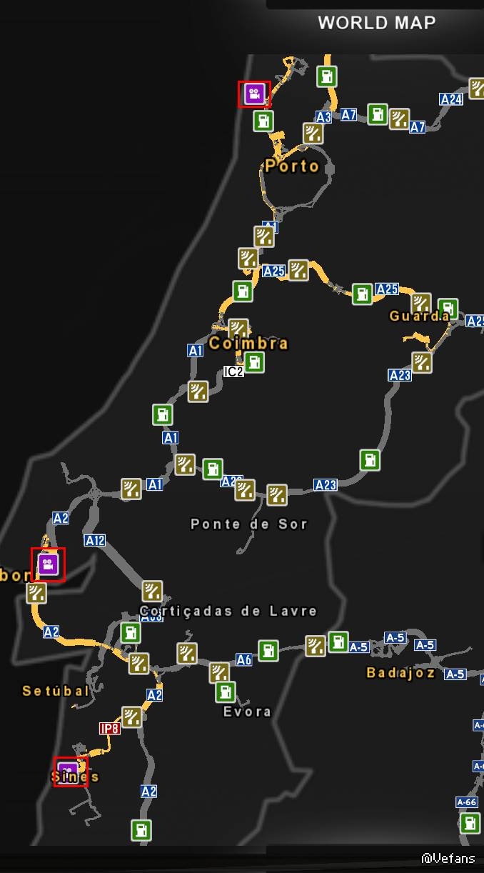 运货到所有集装箱码头。集装箱码头叫做TSATLAS,任务列表按“接收者”排序很容易找到,在如下城市有: 1Algeciras阿尔赫西拉斯 2Valencia巴伦西亚 3Tarragona塔拉贡纳 4Barcelona巴塞罗那 5Bilbao毕尔巴鄂 6Gijon希洪 7Vigo维哥 8Porto波尔图(波尔多) 9Lisbon里斯本 10Sines锡尼什 11Malaga马拉加