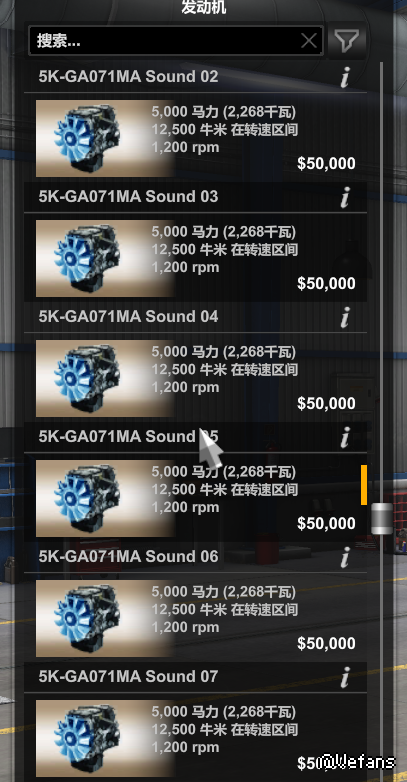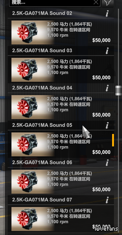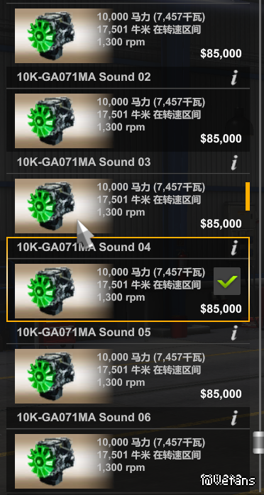目前有2500马力、5000马力、10000马力三种发动机,分别有8种音效,可自行选择