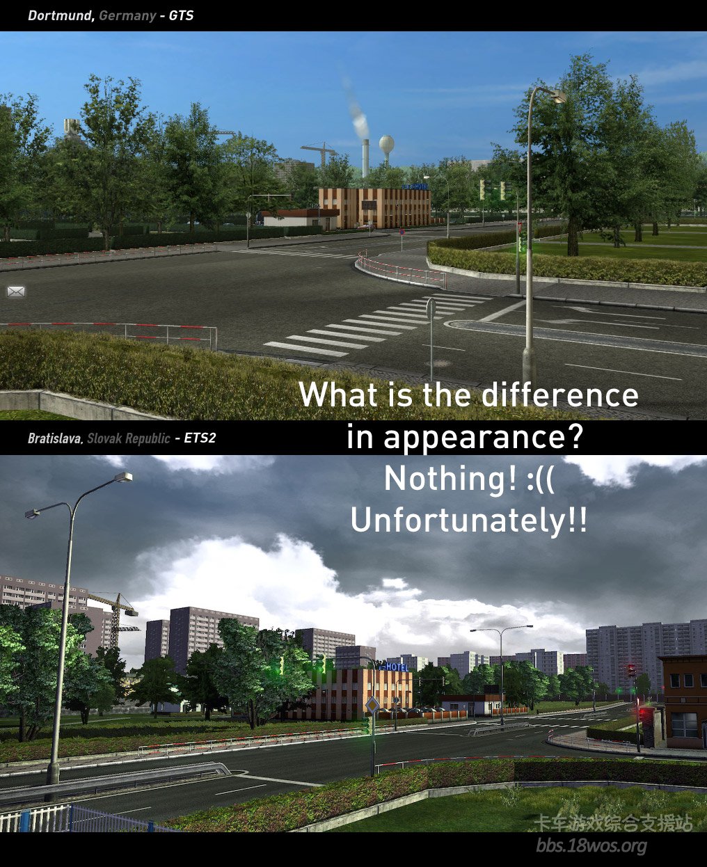 他找到一组同场景的 GTS 和 ETS2的对比图