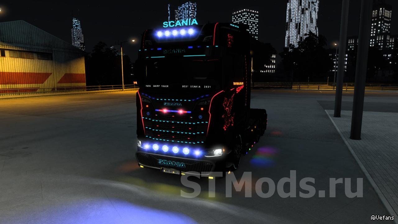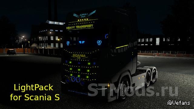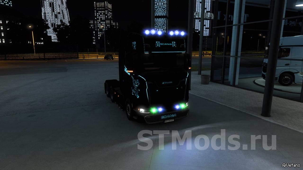 Мод содержит: галогены, маленькие светодиодные фонари для всех грузовиков (без отражения), маленькие фонари с отражением для всех грузовиков, решетки на крыше для Scania S 2016, нижние решетки для Scania S 2016, солнцезащитные козырьки для Scania S2016, табличку со всем алфавитом для : DAF XF 105, DAF XF Euro 6, Volvo FH16 2012, Scania S 2016.