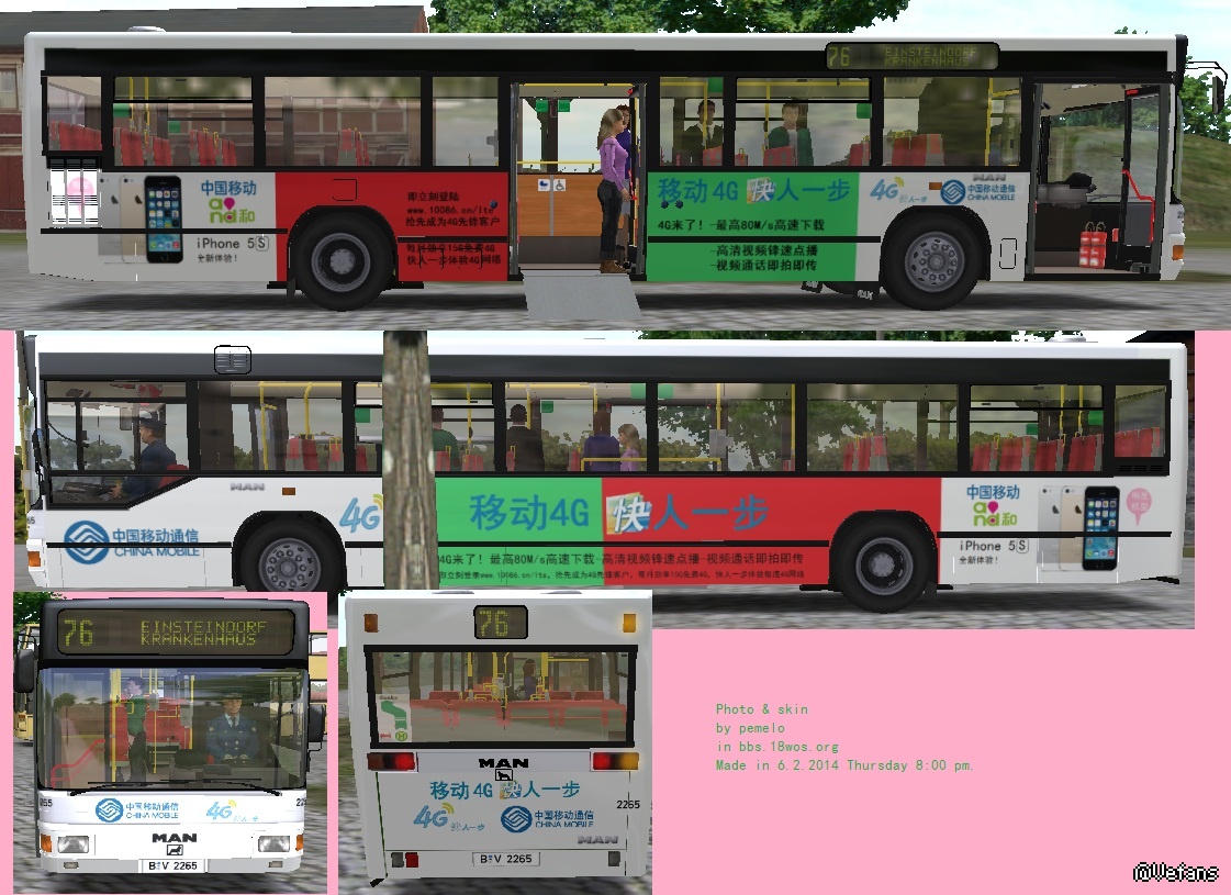 【介绍】:最近街头跑满了移动的广告的公交车,受其影响,就做了这个涂装。这个涂装可能不怎么好,没有用专业软件做,字体什么的可能不怎么好。。 不多说了,发下载链接。