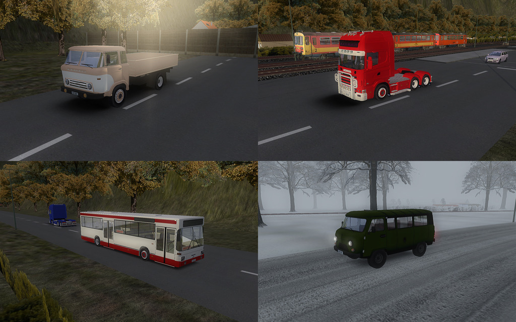 左上 - KAZ 605;左下 - MAN SL202;右上 - Scania 164L;右下 - UAZ 452