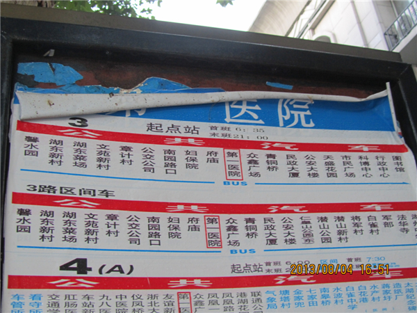 最后一站,第一医院,站牌还是交通学校的样式。(见图49),这里是3,4A,4B,7,8,12,13,30等线路的途经站。在等3路车时,我拍到了30路,有点糊。(见图50、51)