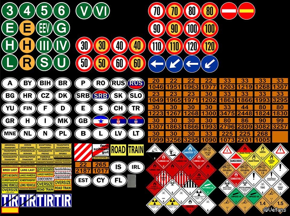 Mod adds more than 341 marking marks to trucks in various categories of country codes, speed limits, warnings, environmental warnings and others.