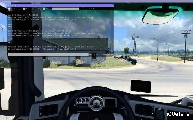 A simple tachograph that considers “driving time” (daily, weekly and two-weeks) and “rest time”. If the speed is more than 1 km/h, then driving time is considered, otherwise rest time is considered. During the game, you can press the hotkey to display the tachograph information in the game console (the default is the F12 key).