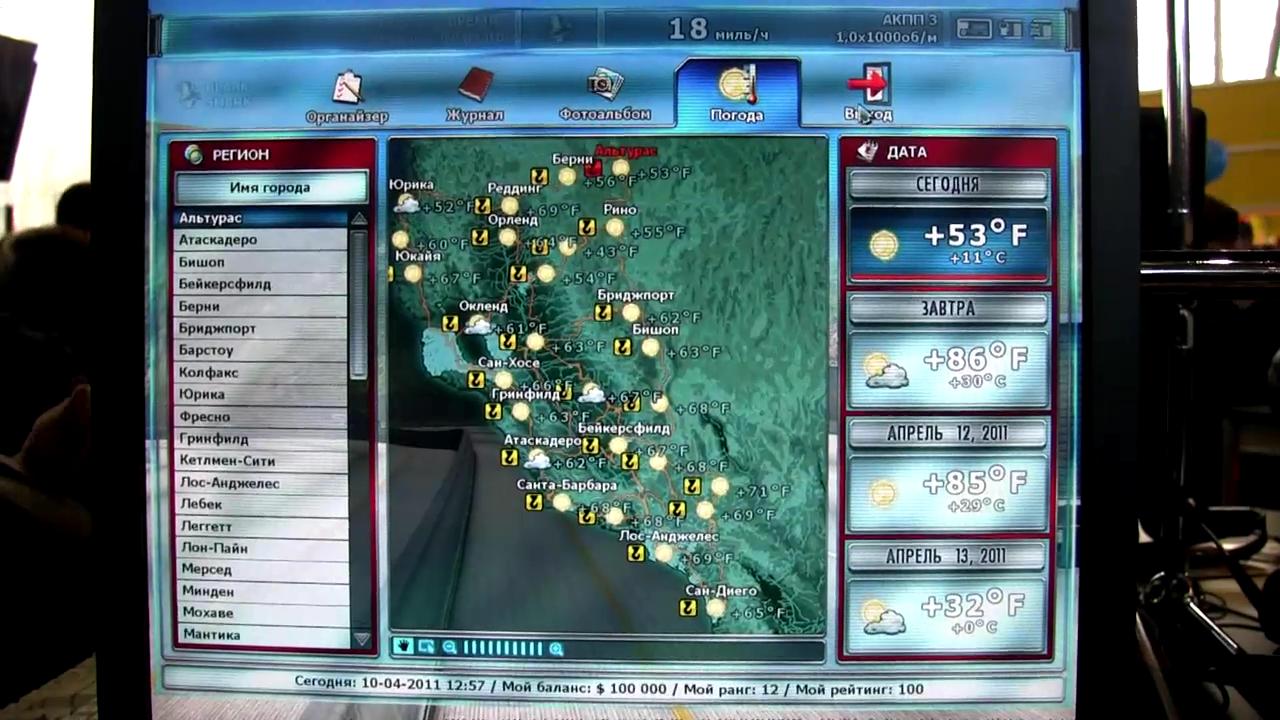 天气查询(包括今天、明天、后天及打后天的天气在画面的右面可以看见,画面最下一排俄语说的是:从左到右(当前日期2011年4月10日12点57分、金钱10000、你的排名12、总排名100)