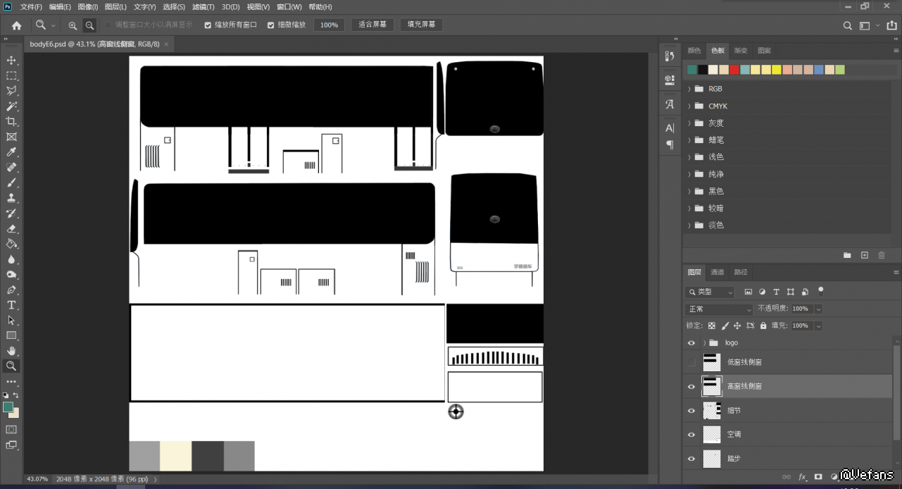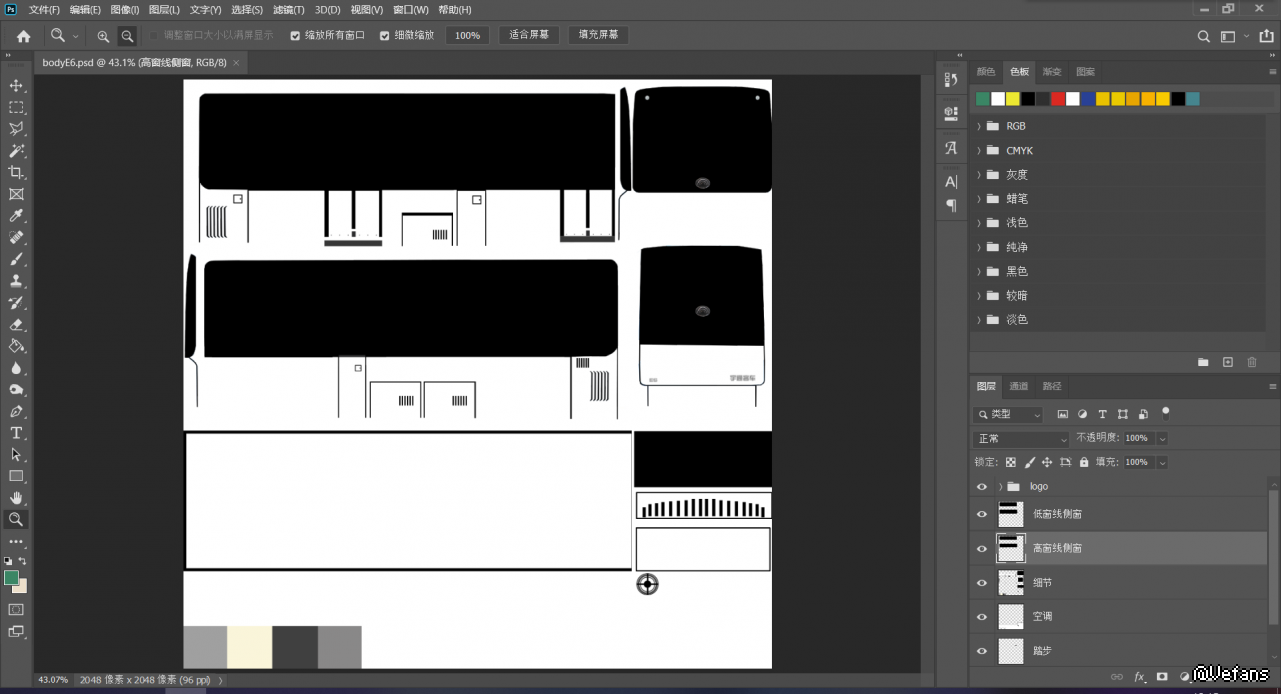 最后是模板,E6的涂装由于没有alpha图层所以没太多讲究,值得注意的是除了细节分层、加车标、踏步上色以外还提供了高低两版侧窗窗线。