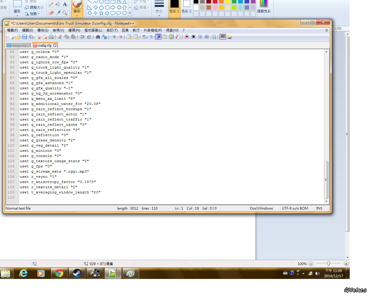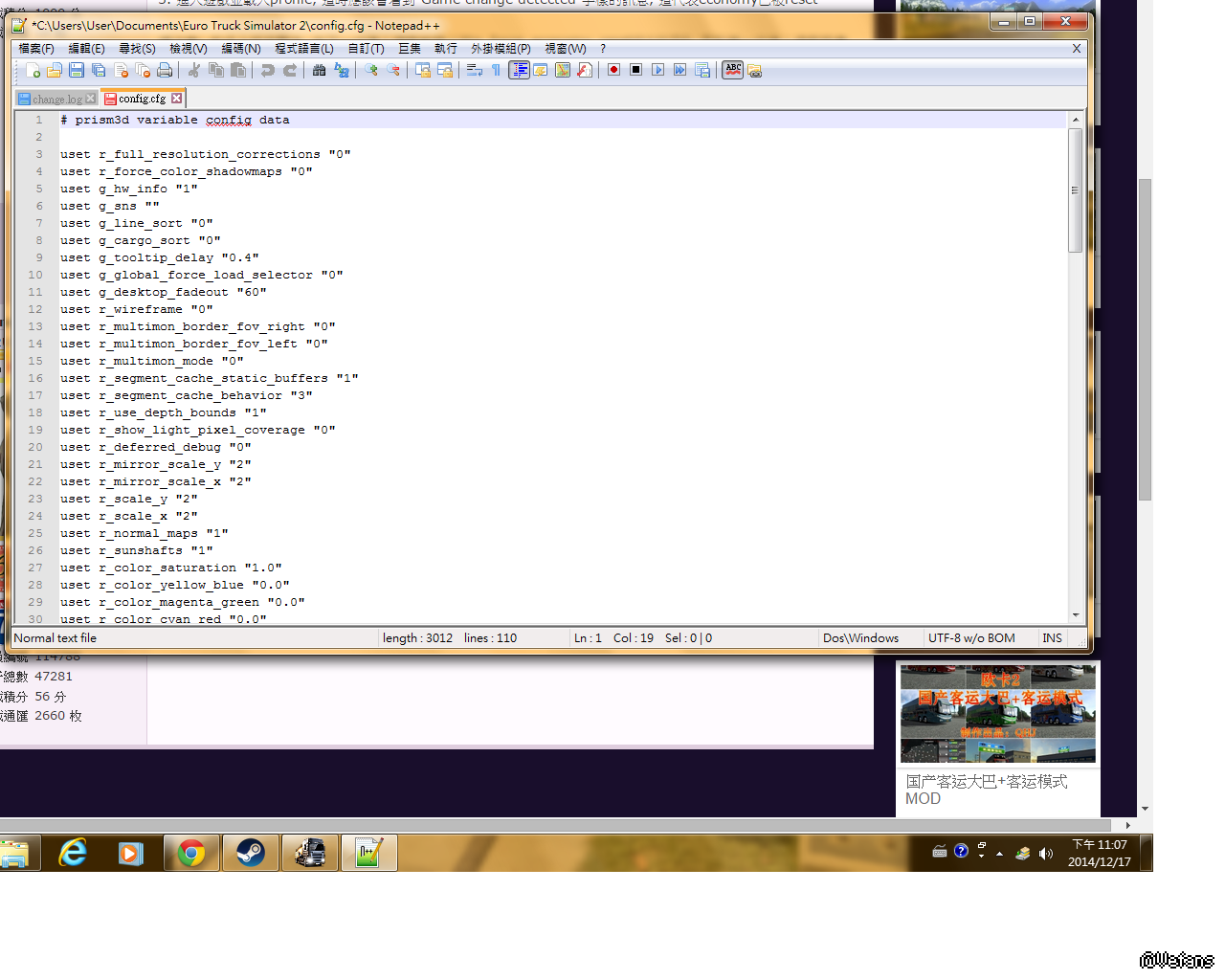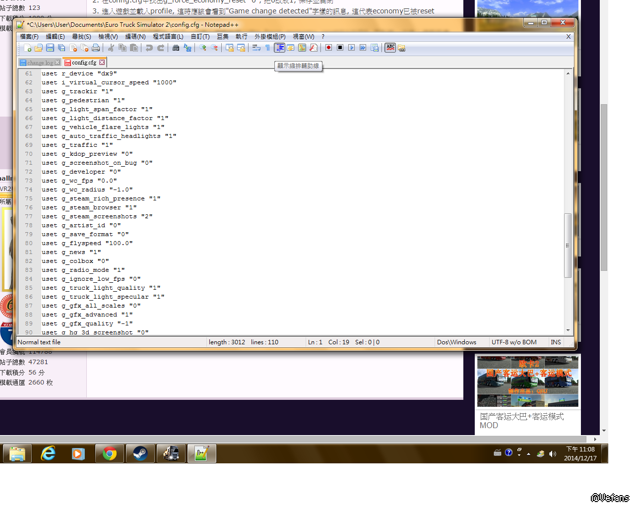 1. 在Documents\Euro Truck Simulator 2\profiles\[你的profile]中找出config.cfg並用notepad打開