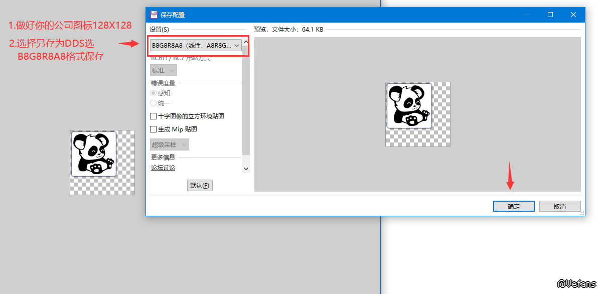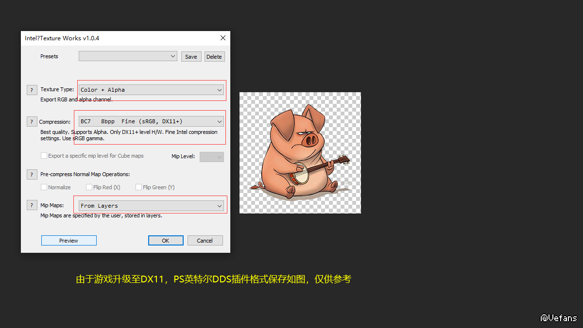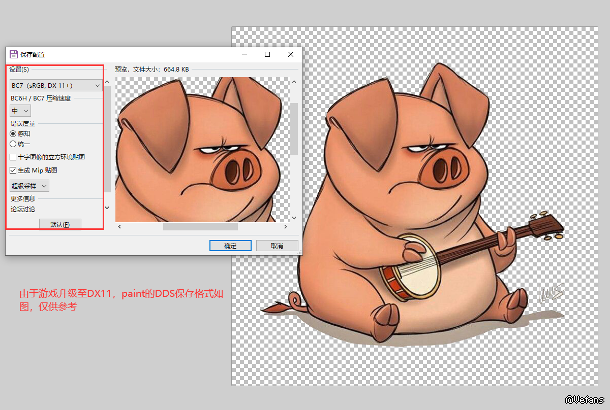 警告:由于游戏已经过渡至DX11,推荐使用BC7,dx11压缩格式保存DDS纹理!PS英特尔插件和Paint设置如图仅供参考